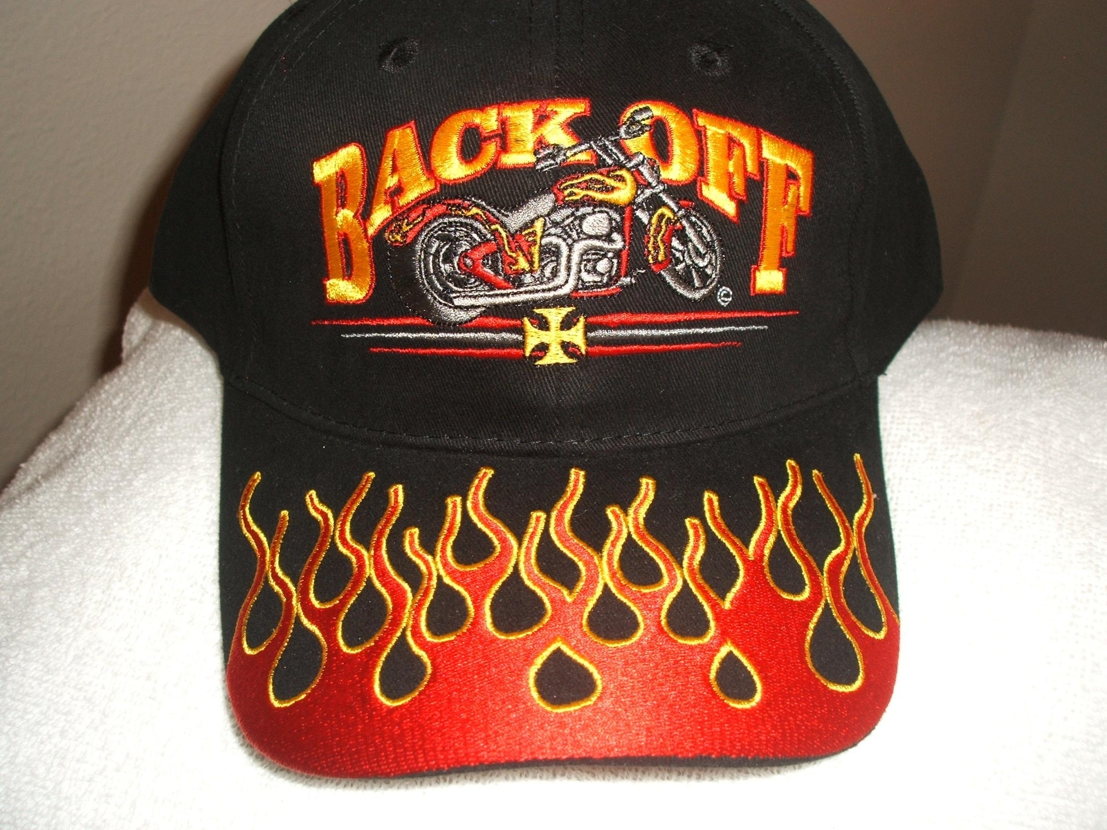 Biker's black ball cap with red flames embroidered on the bill and on the front with "Back Off" and a cycle embroidery. The rear has a velcro strap with CSI tags. only one left..buy it now this may be a dup...only one left..
