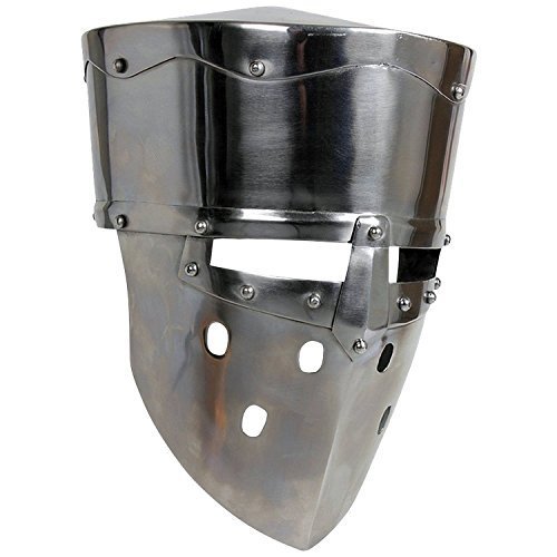 Armor - Crusader Helmet - Steel Armour The typical great helm was exceedingly protective, but also had a few drawbacks to it, as well. This Crusader Helmet - Steel is an attempt to circumvent those drawbacks, featuring some classic elements of the great helmet with a few key revisions. Like the classic great helmet of old, this helm has a rounded crown and a flat top, which provides more than adequate protection when it comes to protecting the head and deflecting blows away from the face. The front of the helmet features a full steel mask with rectangular eyelets and small air hole cut-outs. The mask wraps around the front and sides of the face, but ends short of wrapping all the way around the head, leaving the back exposed. The helmet features an internal liner, both for comfort and for slight adjustment of size. The helmet is crafted from quality steel and also features a shiny metal finish, which gleams in the light and is perfect for creating that 'knight in shining armour' look that so many associate with a crusader or a typical medieval knight. It is a full-sized helmet that is fully wearable, and when worn, it stands up rather well to the rigors and impacts experienced during the course of LARP combat and light reenactment. It is available in two sizes, either medium or large. If you want the traditional look of the crusader or a knight, but in a helmet that's a bit lighter and bit more comfortable to wear, then this Crusader Helmet - Steel is likely just the protection you're looking for. MANUFACTURED SOLD BY NAUTICALMART INC.