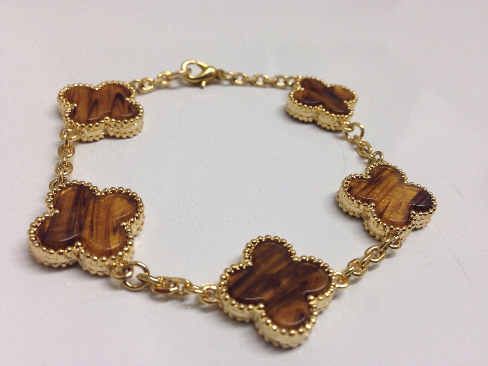 Tiger eye motif bracelet. Gold plated over surgical steel.7 inch in length.
