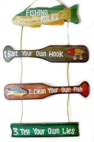 THIS AWESOME "FISHING RULES: 1. BAIT YOUR OWN HOOK. 2. CLEAN YOUR OWN FISH 3. TELL YOUR OWN LIES" SIGN IS BRILLIANTLY HAND CRAFTED AND DETAILED OUT OF WOOD , SEE THE MAGNIFICENT DETAIL DONE BY OUR OWN MASTER CRAFTSMEN. THIS BEAUTIFULLY DETAILED WOODEN WALL ART IS OUR OWN CREATION. WE HAVE BEEN CREATING AND IMPORTING COLLECTIVE ART FOR MORE THAN 18 YEARS. WE BRING DIRECT TO YOU THE FINEST CRAFTED ART OF THE BEST QUALITY AND PRICE. SIZE OF THIS ITEM IS APPROX 19.5-20" long x 32 HIGH x 1.5 WIDE please allow for variation in size and color due to items being handmade.