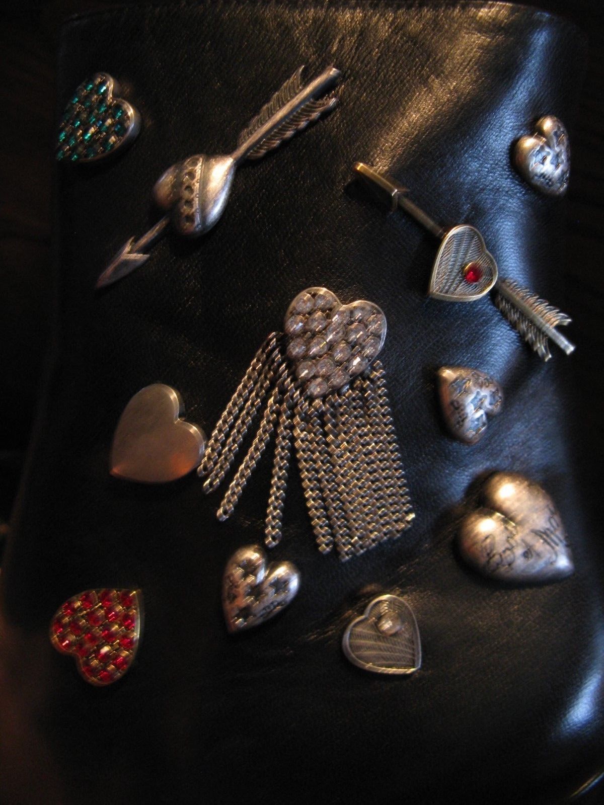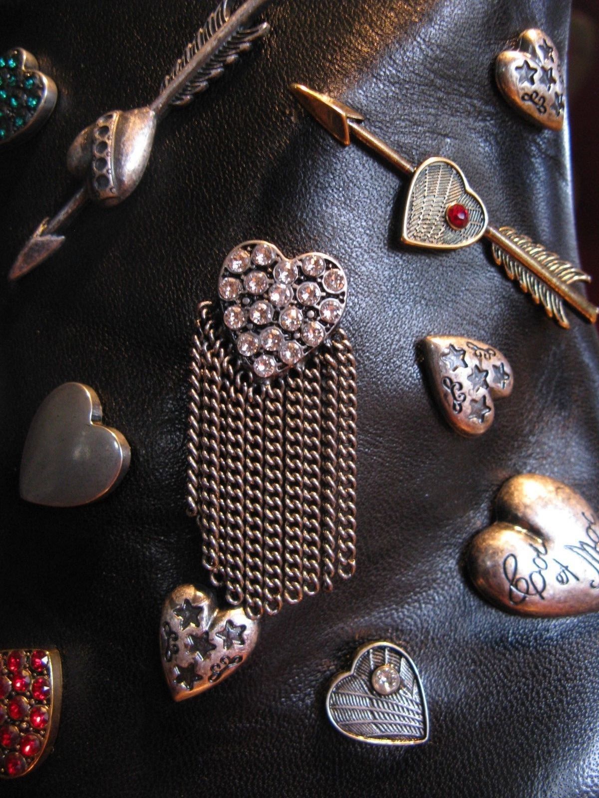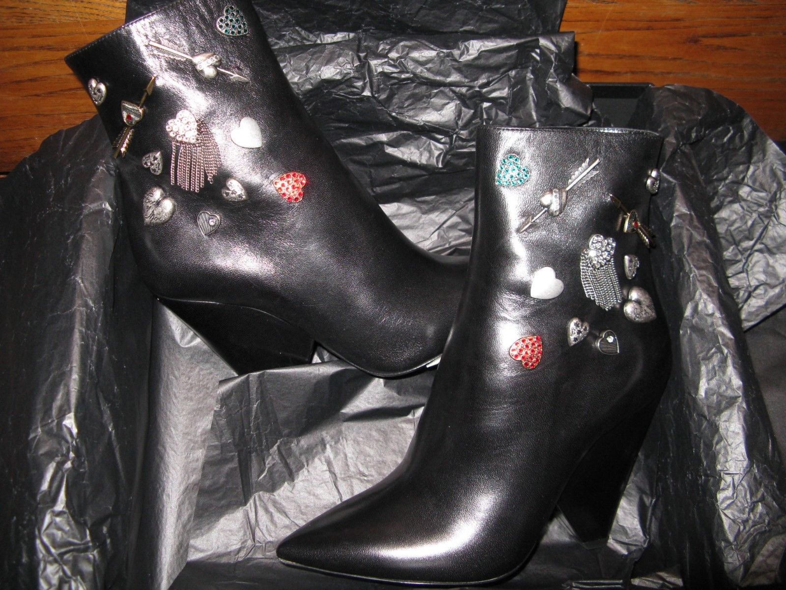 New in box, Saint Laurent Charm booties with a cone heel in size 37. Covered in oodles of cool metal charms! There is sticker residual on bottom of right boot. Please know your size in these as I do not take returns. I will be listing designer fashions all month.Please ask all questions before bidding as all sales are final. I will combine shipping for multiple purchases, so be sure to visit my new store Wall Street Rodeo Vintage Couture! Please contact me for international, Alaska, and Hawaii shipping.