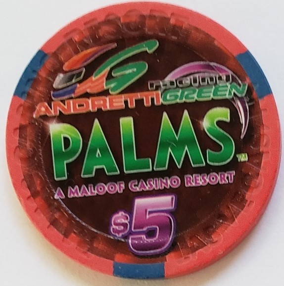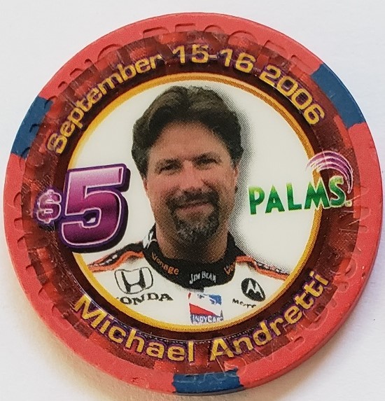 $5 Palms Casino Resort chip featuring Michael Andretti in Andretti Racing Green. Dated September 15-16, 2006.