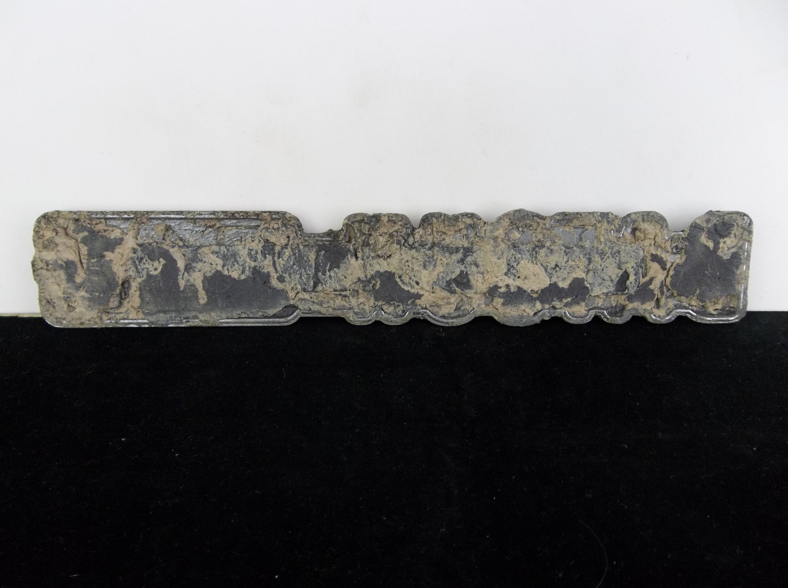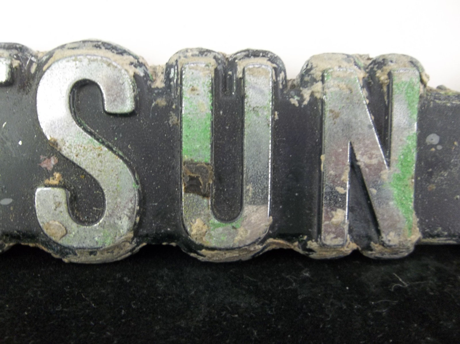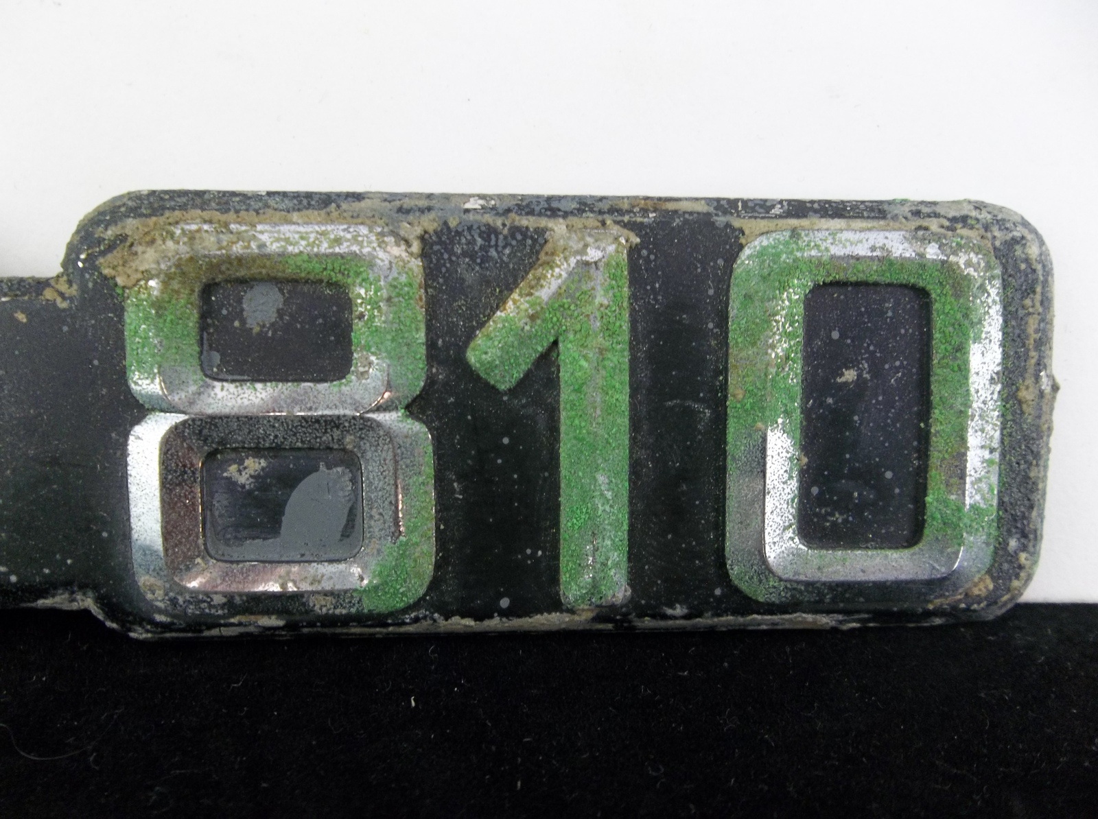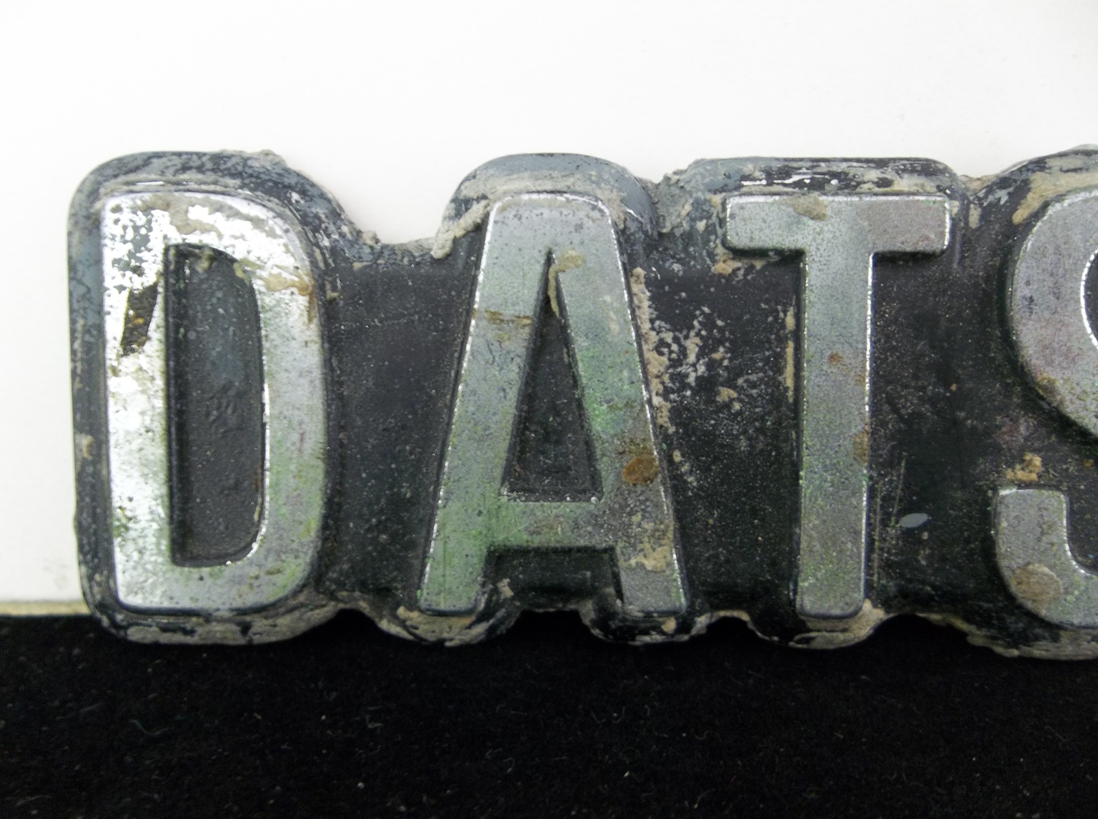 Condition: The emblem is in rough used condition. The emblem shows heavy wear and oxidation on the chrome letters. The black inlay paint has paint loss. I don't see any cracks or breaks in the emblem.