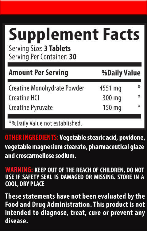 Creatine Tri-phase NEW FORMULA: NEW Premuim Blend of Creatine Monohydrate, Creatine Alphaketoglutarate and Creatine Pyruvate. Creatine Alpha-Ketoglutarate: The Future Of Creatine Has Arrived! One of the most innovative and increasingly popular forms of creatine available today is creatine alpha-ketoglutarate (a.k.a., creatine-AKG). Creatine supplementation may increase muscle mass, strength, and power. Serving Size - 3 Tablets. Total Servings - 30. Tablets per Bottle - 90.