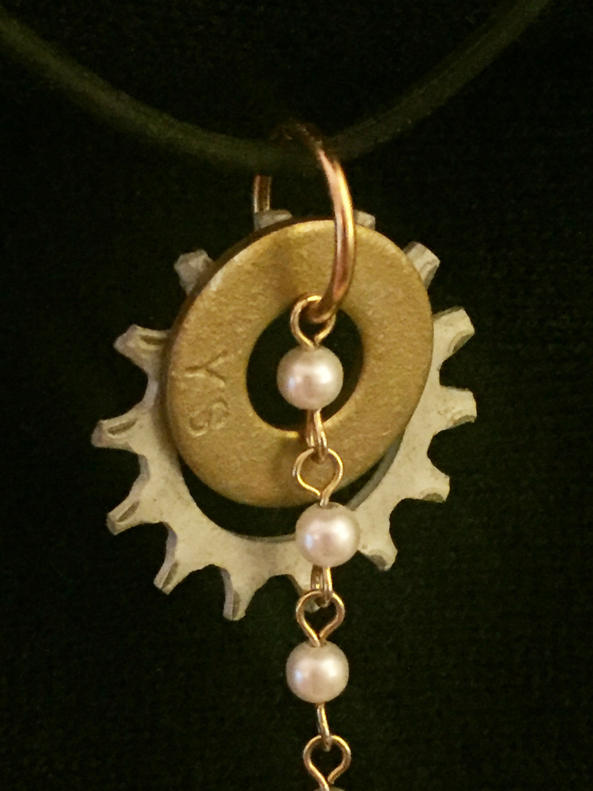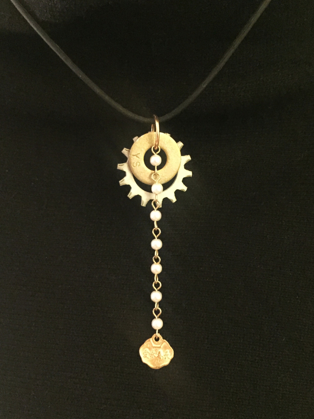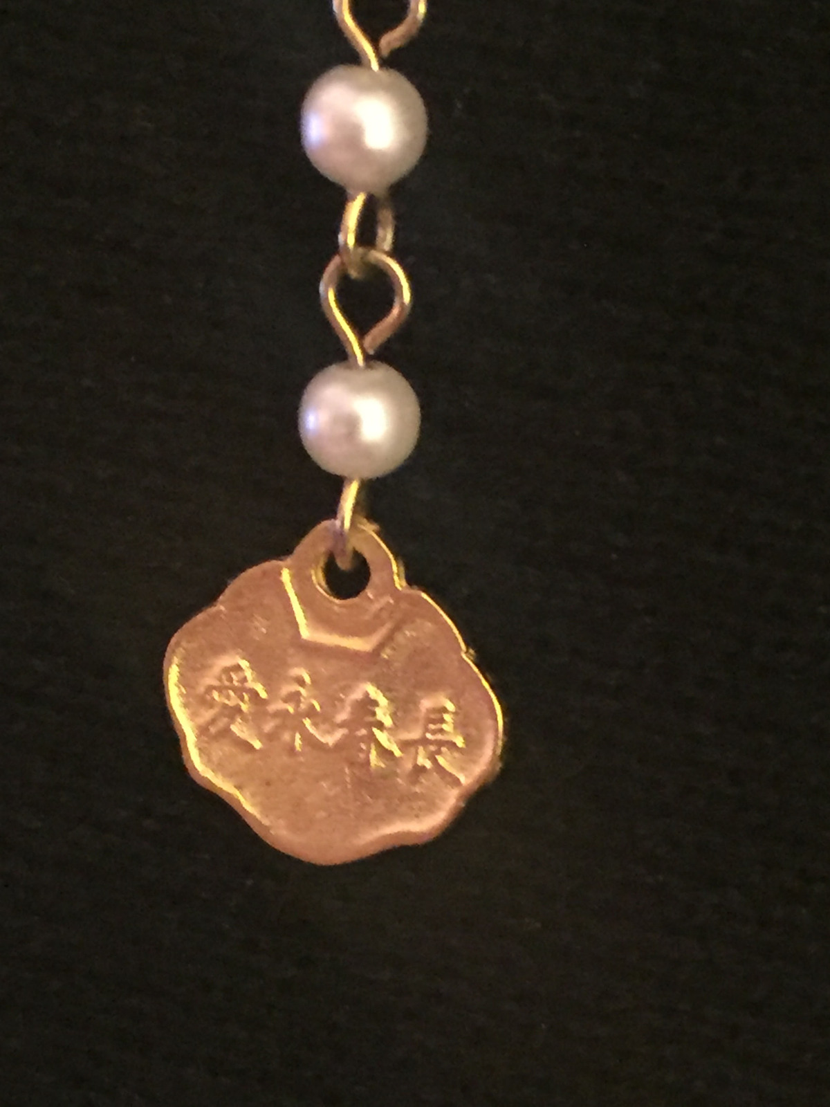 Features: Recycled hardware, imitation faux pear rosary style chain, asian language gold tag