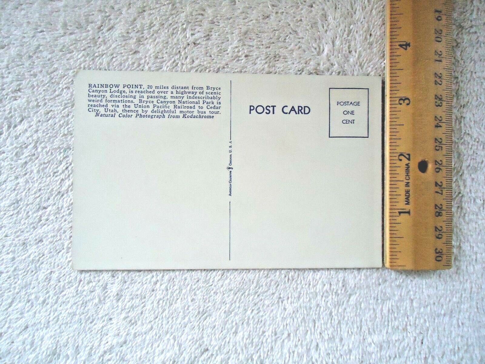 Here is a Vintage " NOS " Rainbow Point Bryce Canyon National Park Utah Post Card " BEAUTIFUL COLLECTIBLE ITEM ".Make sure to SEE ALL PICS FOR CONDITION(S),TYPE,SIZE,ETC.This is a must for any collector,or decorator wanting that vintage retro look.The pics do not do this item(s) justice.If you have any concerns or questions about this item(s) please ask before bidding / purchasing because this item(s) is being SOLD AS IS.Thank You.-(BCT)