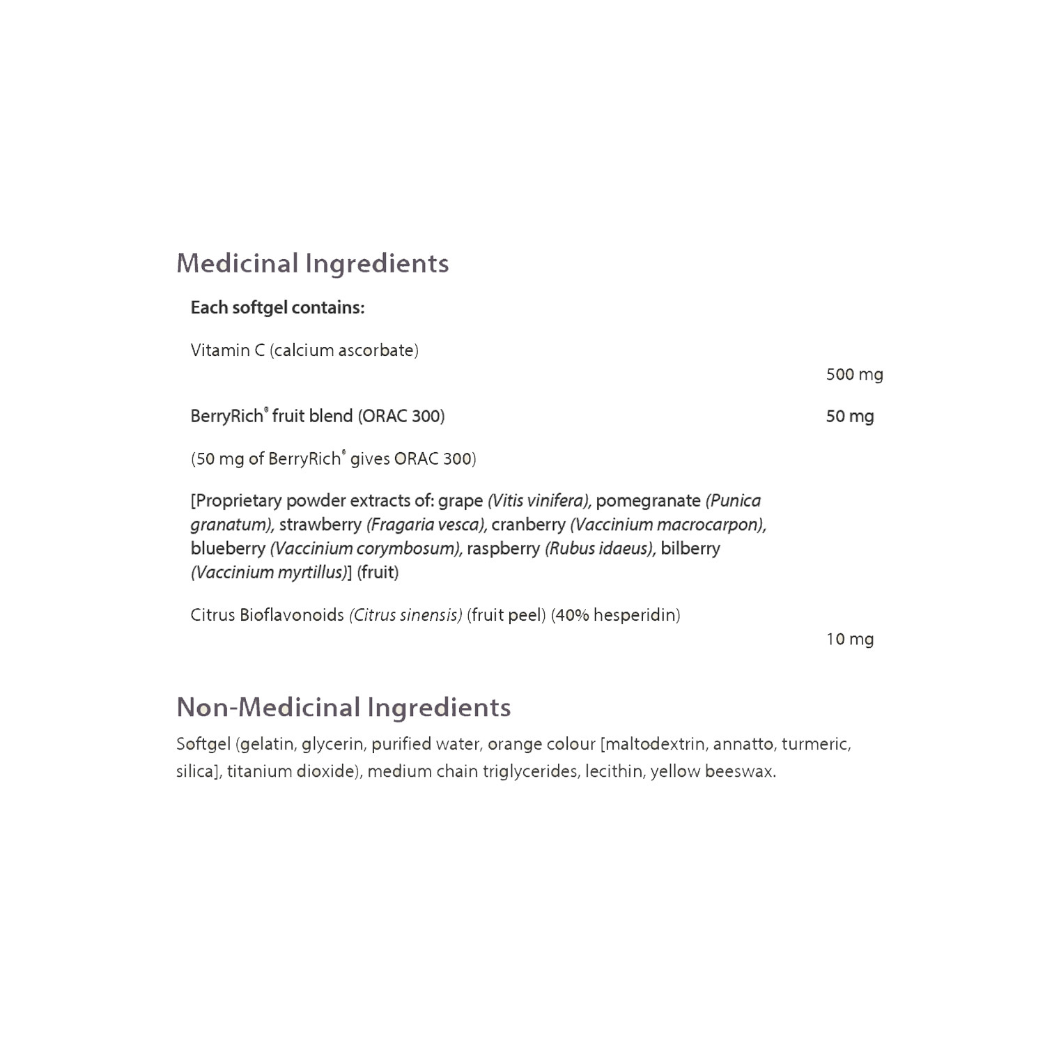 Vitamin C, calcium, Berry Rich, citrus bioflavinoids, gelatin, glycerin, purified water, annatto, turmeric, titanium dioxide, medium chain triglycerides, soy lecithin, yellow beeswax
