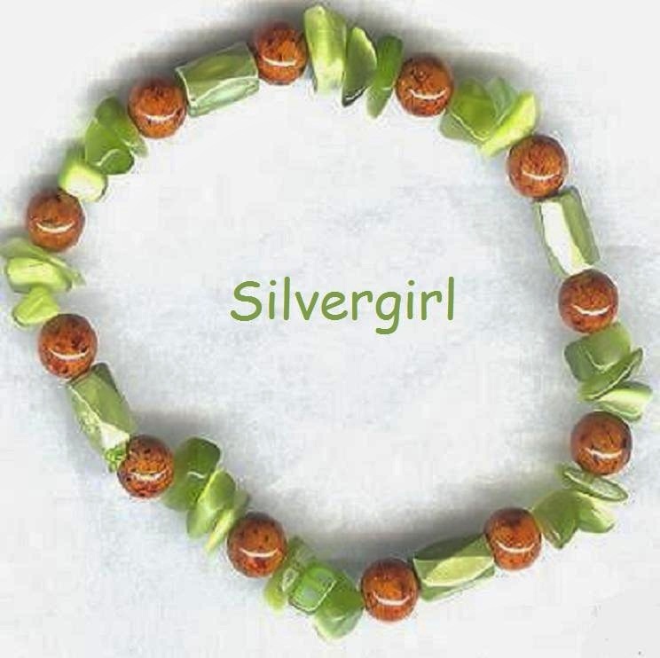 I have used 6 X 8mm faceted magnetic green colored beads, 6mm caramel fossil round beads and pretty shimmering matching green cat's eye polished gemstone chips to make this 7 1/4" bracelet and strung with special strong beading elastic.