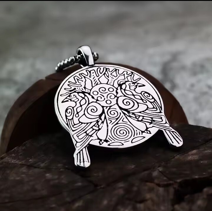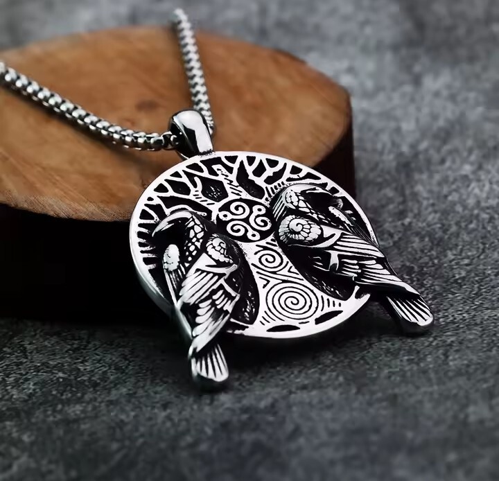Norwegien Viking Doubled Sided Pair Black Ravens and Axe Silver Amulate Necklace
