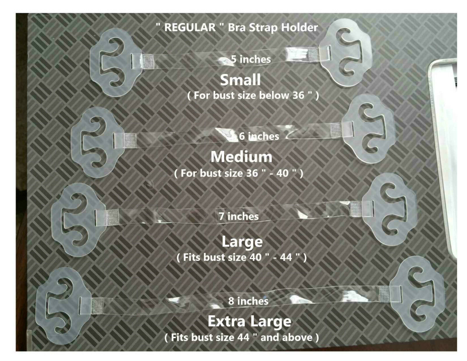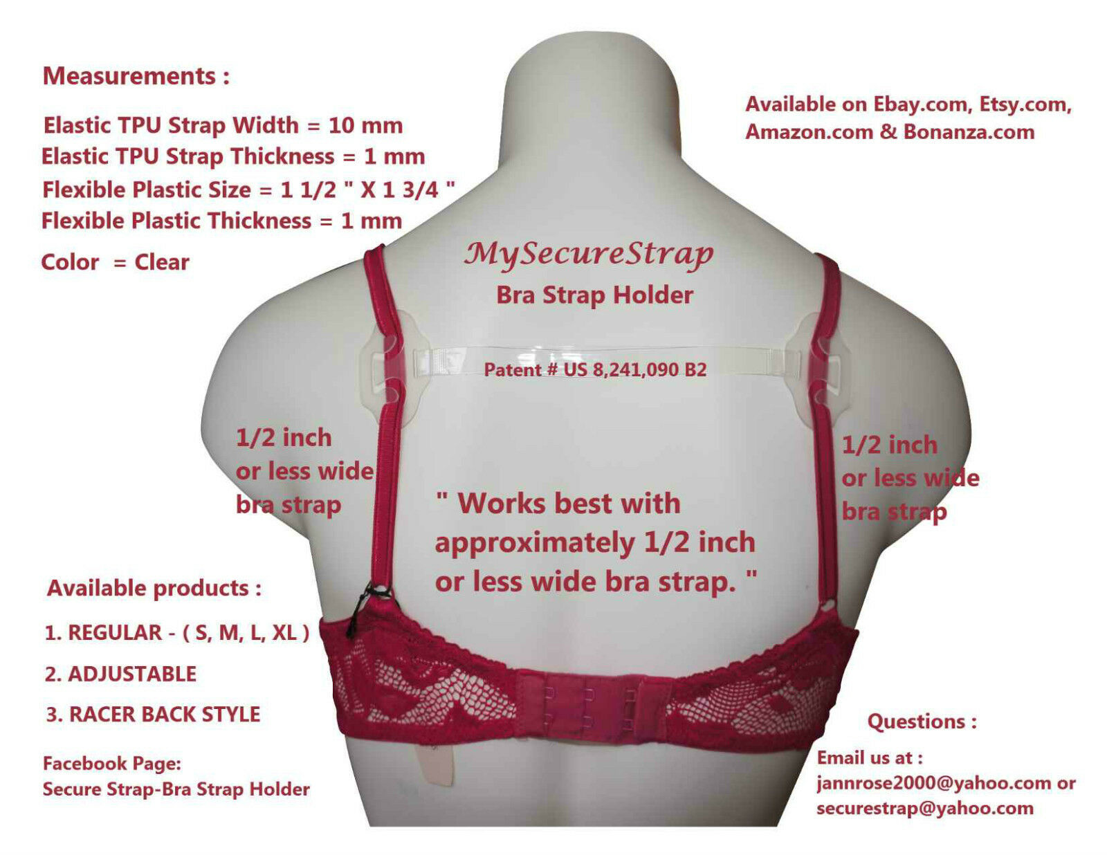It is comprised of a clear Elastic Strap welded to a three (3) pronged flexible plastic ends which attach to the bra strap.