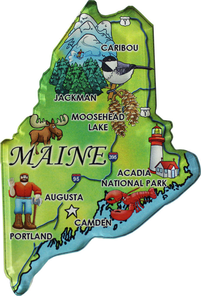 Maine State Mapmagnet, measures approximately 3.25 inches by 2.25 inches and includes a 1/4 inch of crystal clear acrylic. Use the .25 mil magnet backing to display your magnet on any smooth metal surface. Sizes are approximate and vary by state.