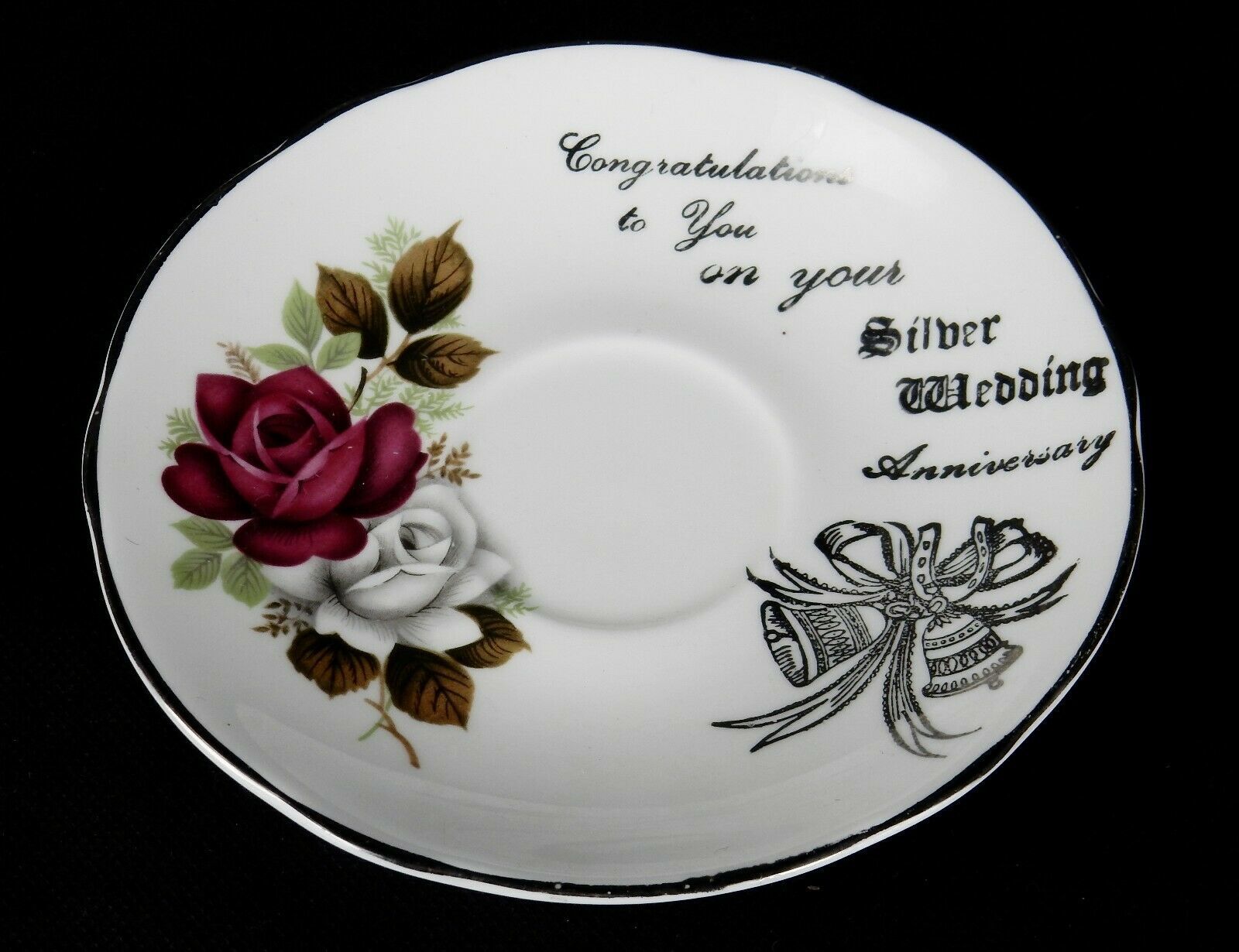 Silver Wedding Anniversary Teacup Saucer with Red White Roses by Duchess