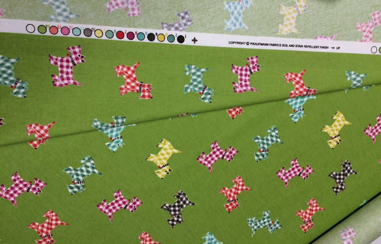 P Kaufmann Hottie Scottie 002 Sprout from the Talk to Me collection brings the plaids and the pups together in a delightful print pattern that will make everyone smile at these cheerful three inch by two and a half inch Scotties. Wonderful Spruce Green, Aqua Green, Lemon Yellow, Tomato Red, Stone Grey, and Raspberry plaids are best of show against a Basil Green background. Hottie Scottie is suitable for window treatments, cornice boards, pillows, cushions, bedding, headboards, aprons, tote bags and furniture upholstery.