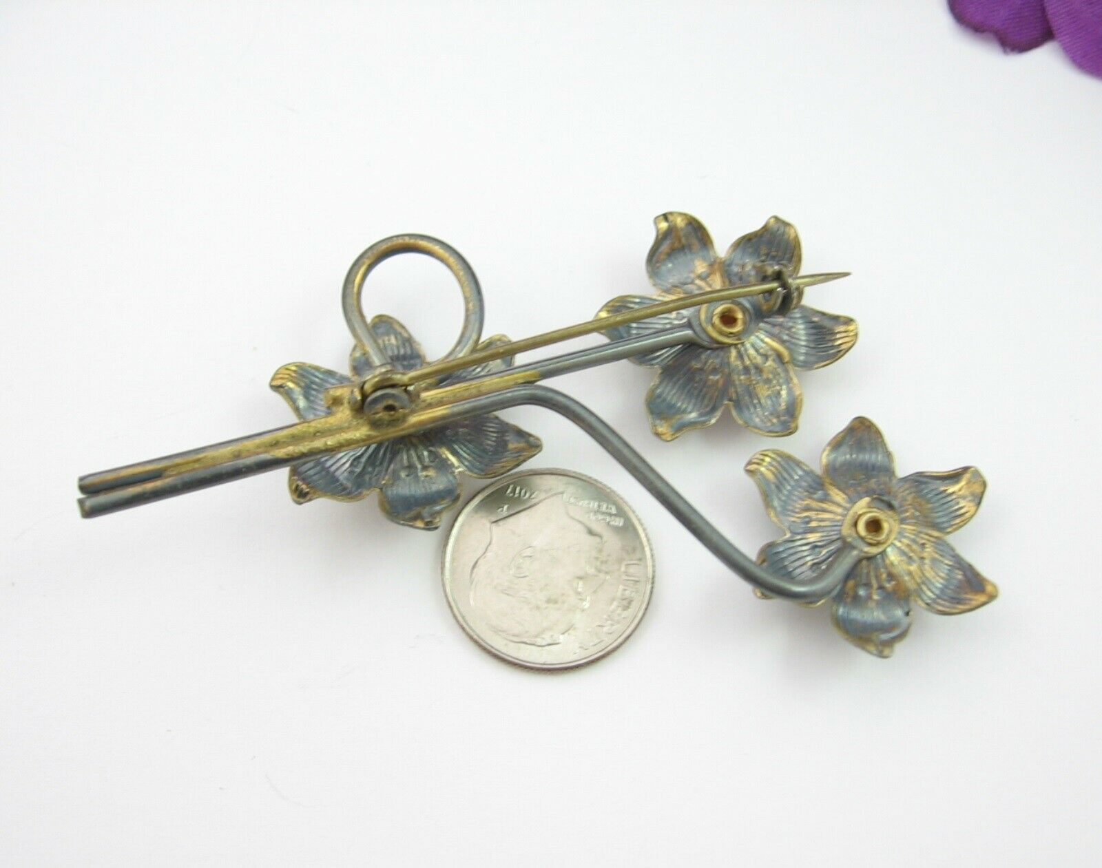 This long pin has the three flower blooms in an unusual pattern; one flower has a straight stem and one takes a big turn off to the side so that they are almost side by side.