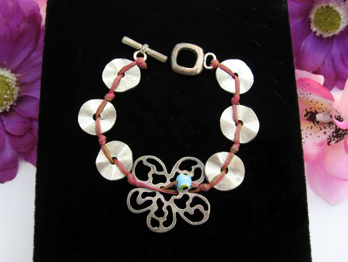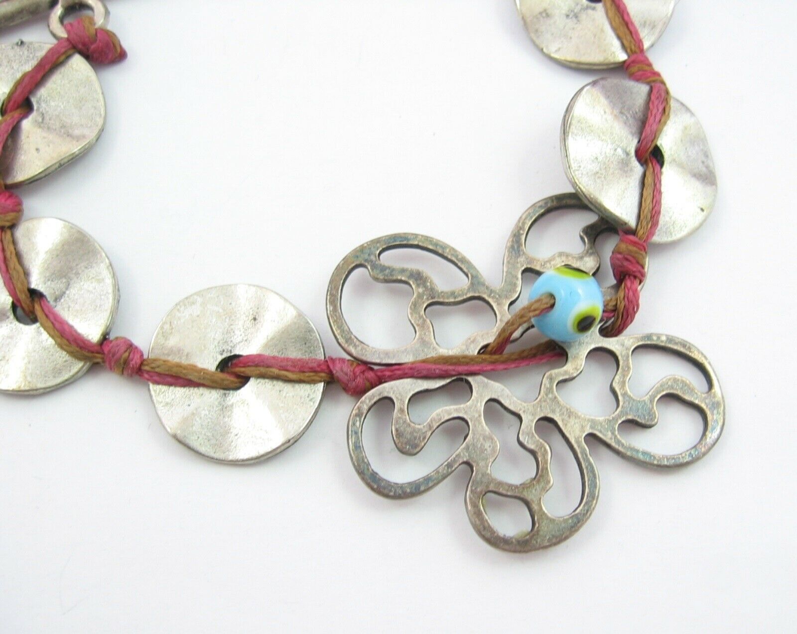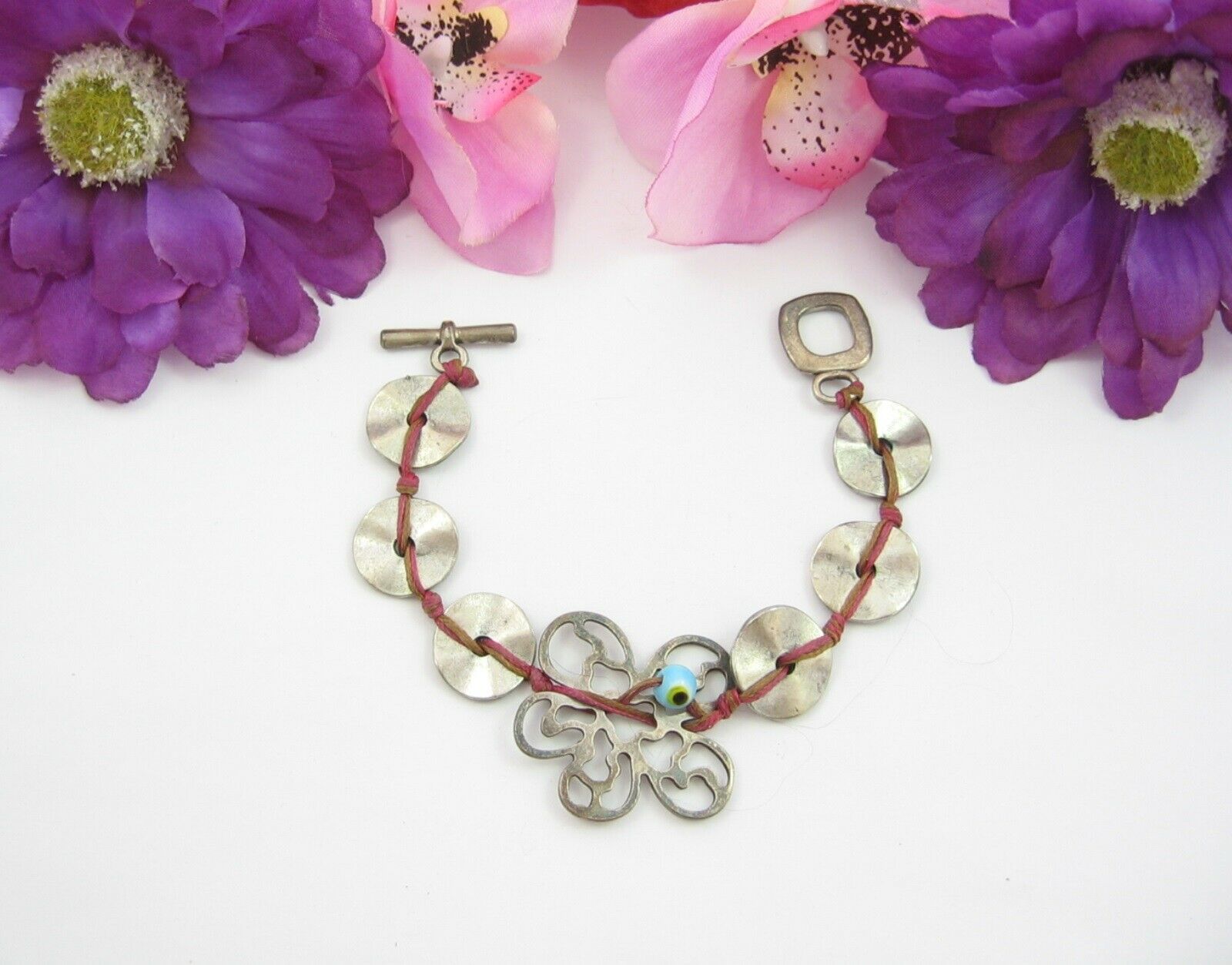 METAL Flower DISKS Blue Art Glass Bead BRACELET Vintage Silvertone Threads