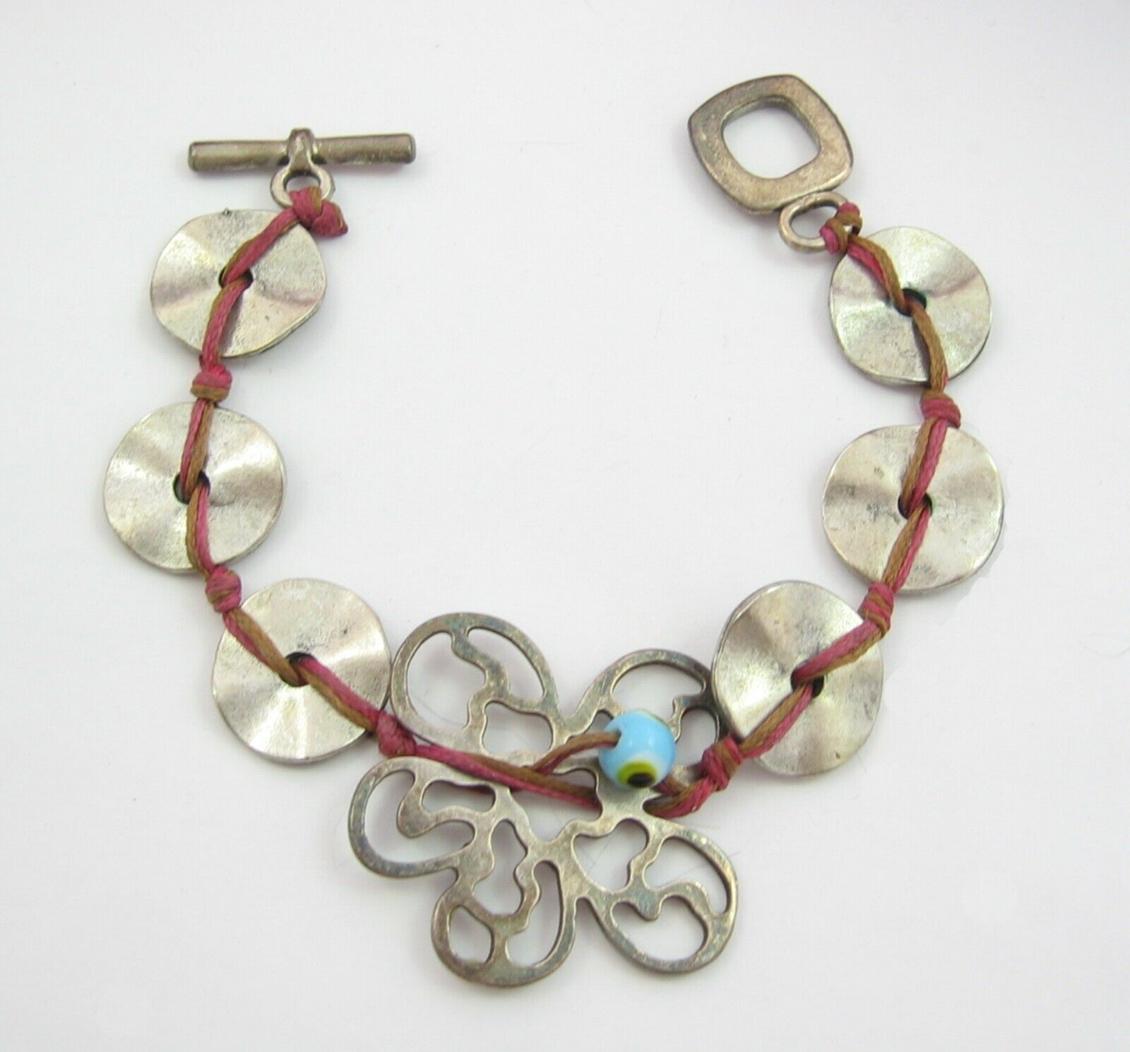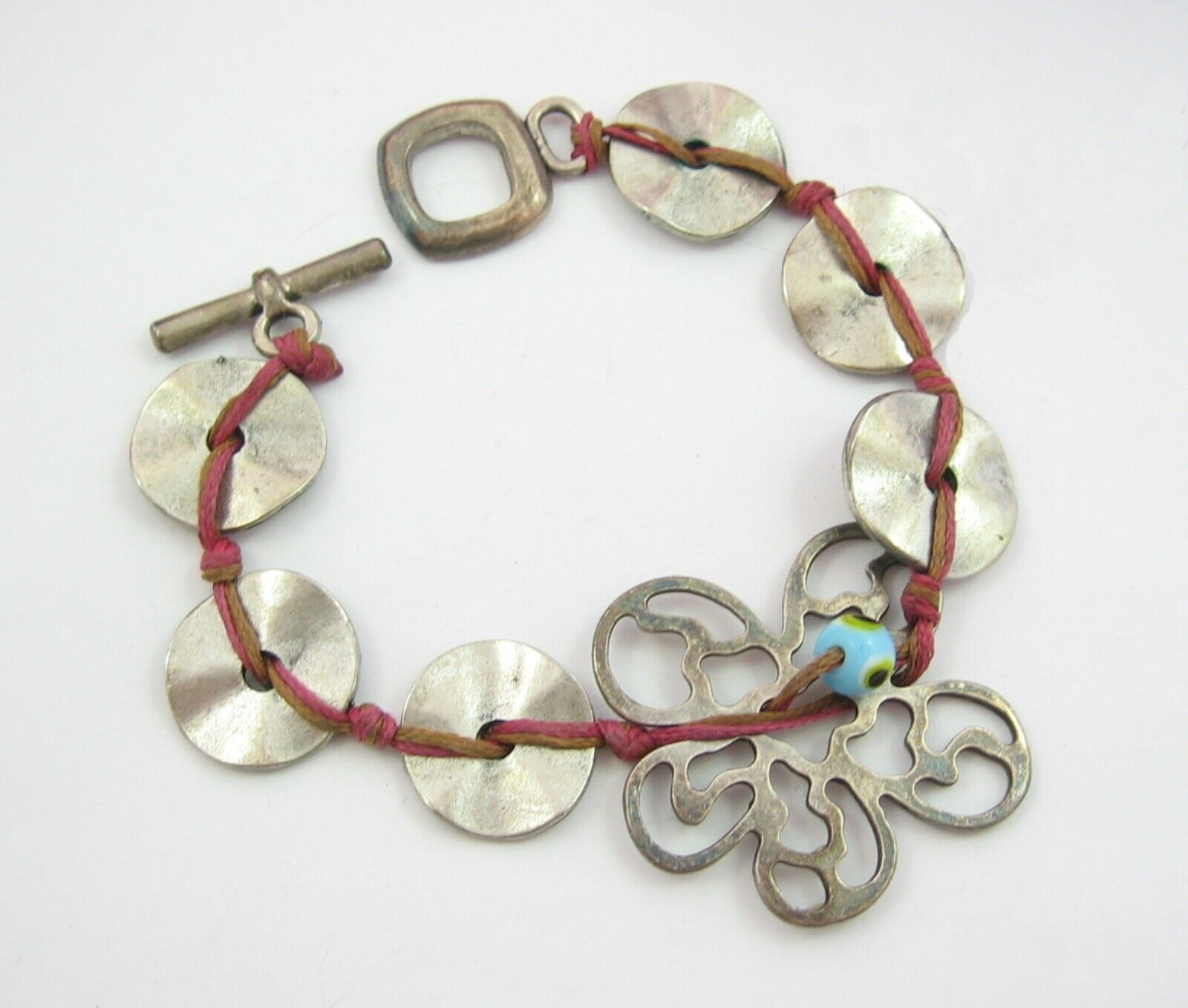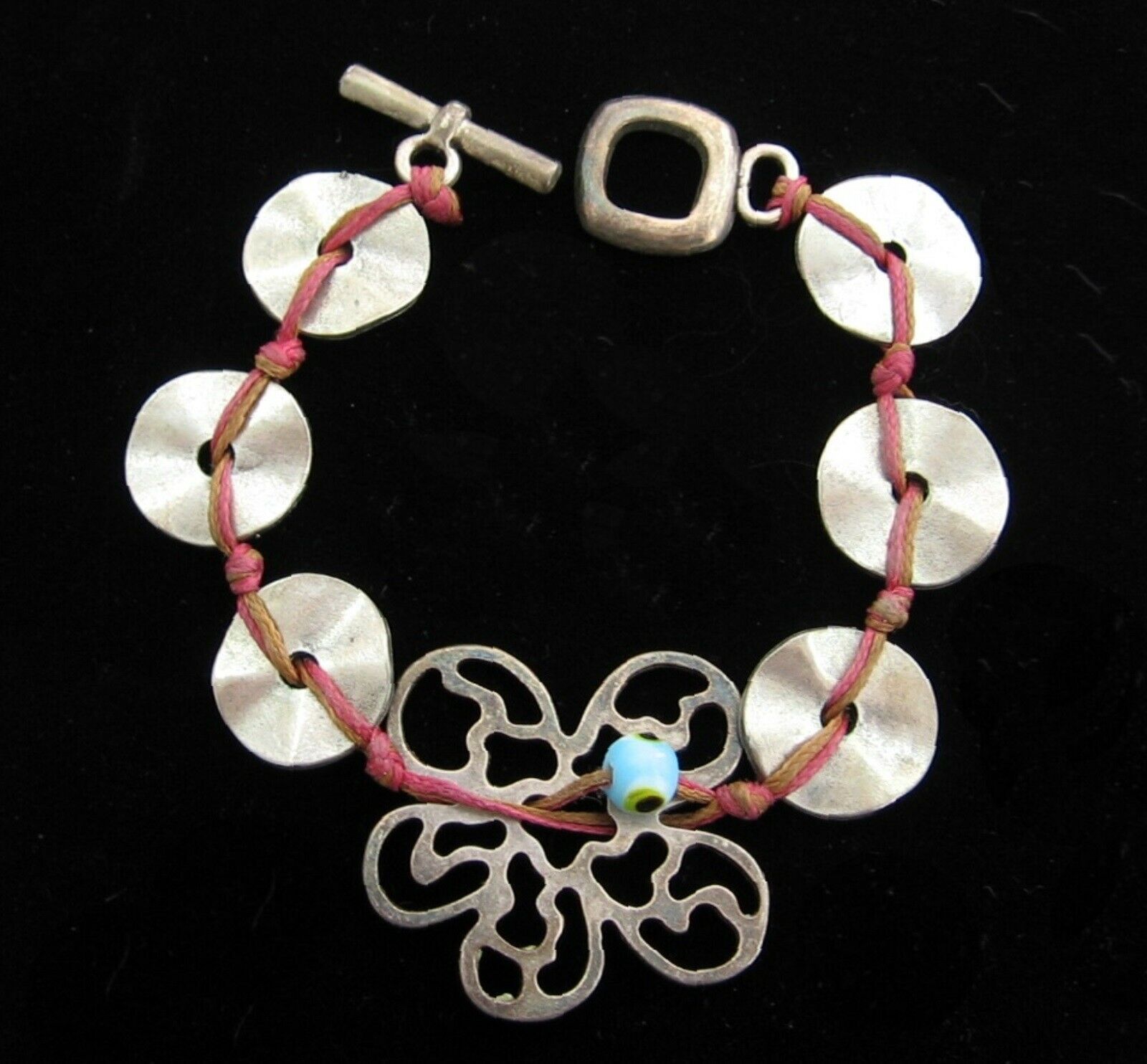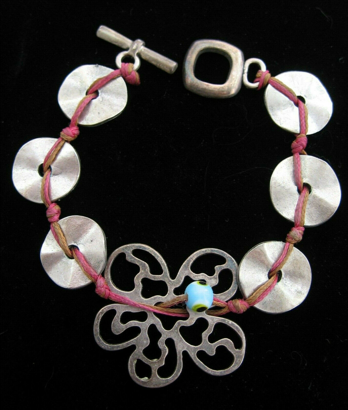 METAL Flower DISKS Blue Art Glass Bead BRACELET Vintage Silvertone Threads
