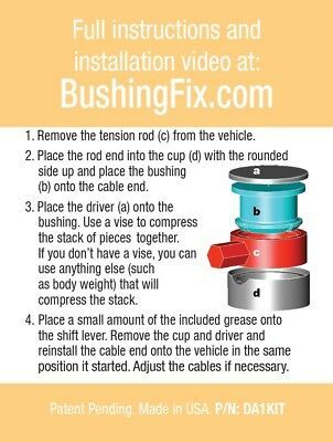 This is a complete kit engineered to provide a safe and effective means to replace the transmission bushing. Item includes not only 2 replacement bushings but the installation tools as well. The patented (US Patent # 10,215,273 US Patent # 10,619,723) kit allows you to quickly and easily repair your shift cable by replacing the bushing. A professional can perform this repair in under 2 minutes, average time for a non-professional is less than 5 minutes.