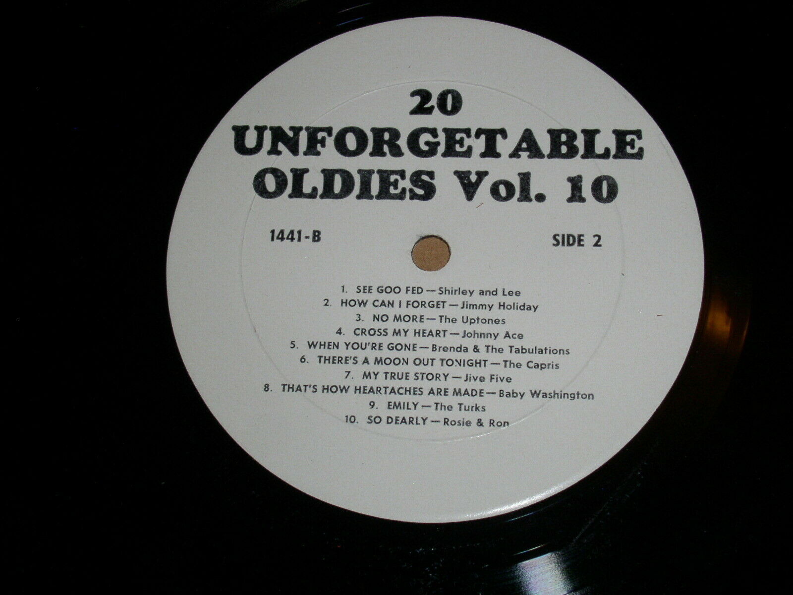This is a vintage phonograph record album entitled, "20 Unforgetable Oldies Vol. 10". Record number 100. Comes in a plain sleeve only as shown. Note mispelling of the word on the label.
