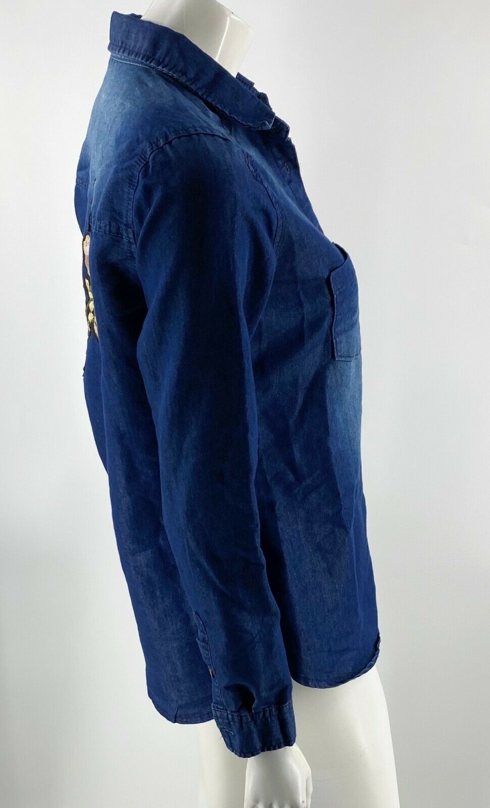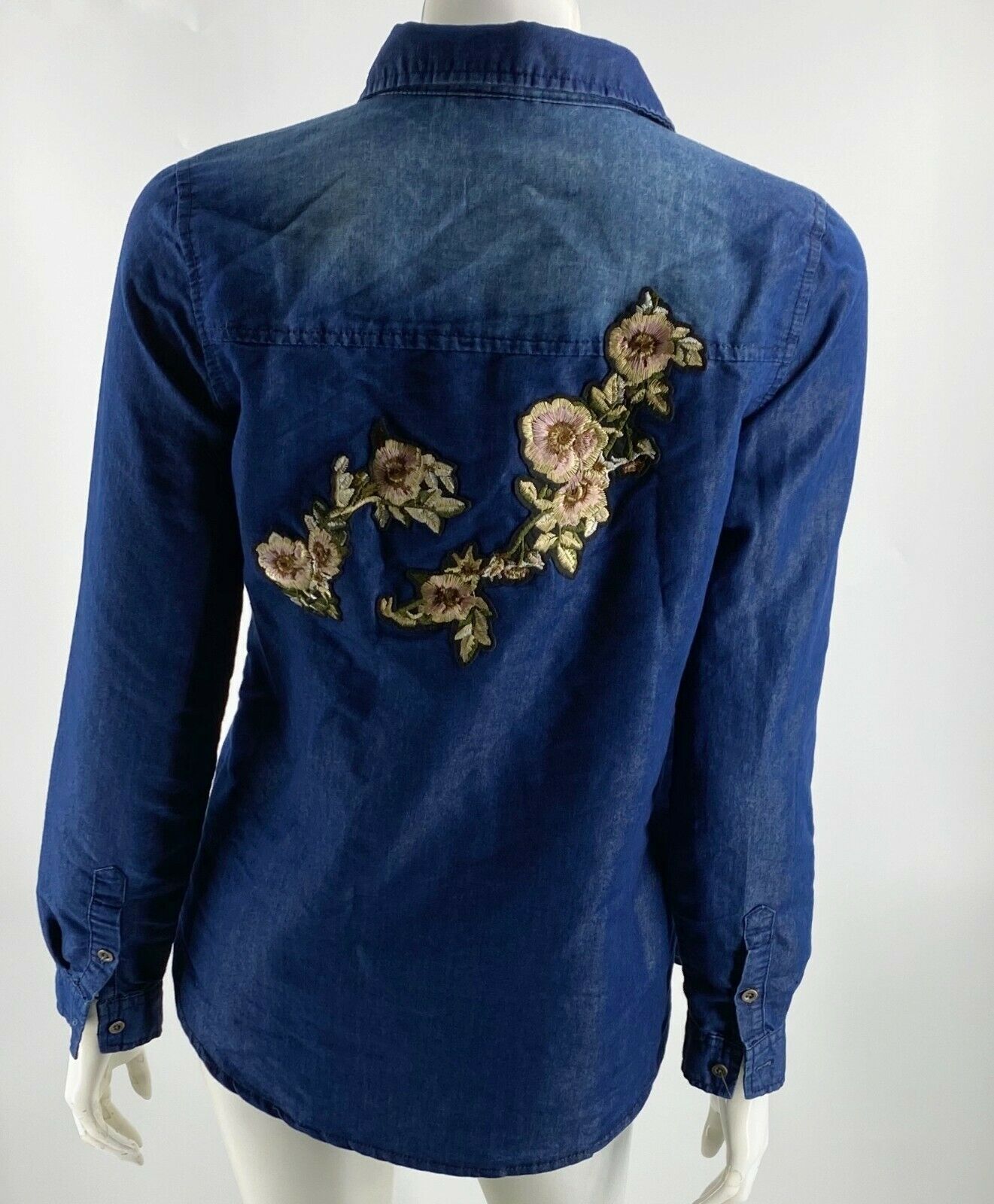 Polly & Esther Top Sz Small Dark Blue Button Up Floral Embroidered Shirt Womens