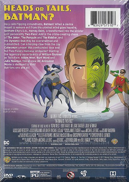 Plot: Holy coin flipping conundrums, Batman! When a device meant to remove the evil from the criminal mind goes haywire, Gotham City’s D.A., Harvey Dent is transformed into the sinister split personality – Two-Face! Add in the crime creating chaos of Joker, Penguin, Riddler and the Dynamic Duo may be overwhelmed and outmatched. Can a helping claw from the coy Catwoman unravel this confounded case and foil Two-Face’s maniacal endgame? Starring the legendary voice talents of William Shatner as Two-Face, Adam West, Burt Ward, and Julie Newmar, this DC Original movie is destined to thrill Bat-fans one and all! 080120-080120P-DVD2