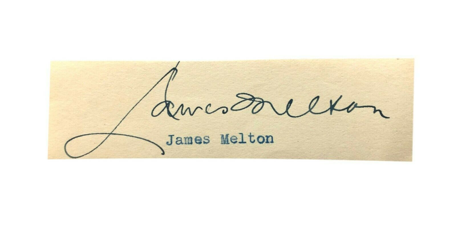 ITEM: JAMES MELTON HAND SIGNED ALBUM PAGE!!! THIS WHITE ALBUM PAGE MEASURES APPROX. 1 3/4" X 3" IN SIZE. THIS IS A MUST HAVE ITEM FOR ALL FANS OF THE ICON!! AUTOGRAPHS OF HIS ARE VERY DIFFICULT TO COME BY BECAUSE HE DIED WAY BACK IN 1961!