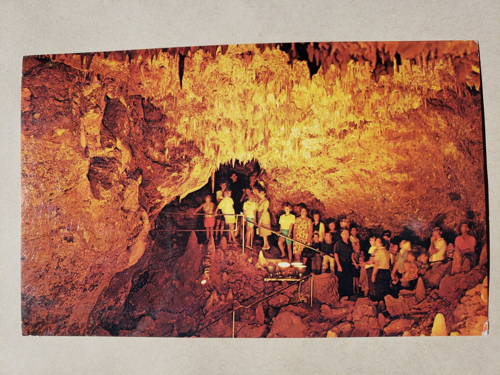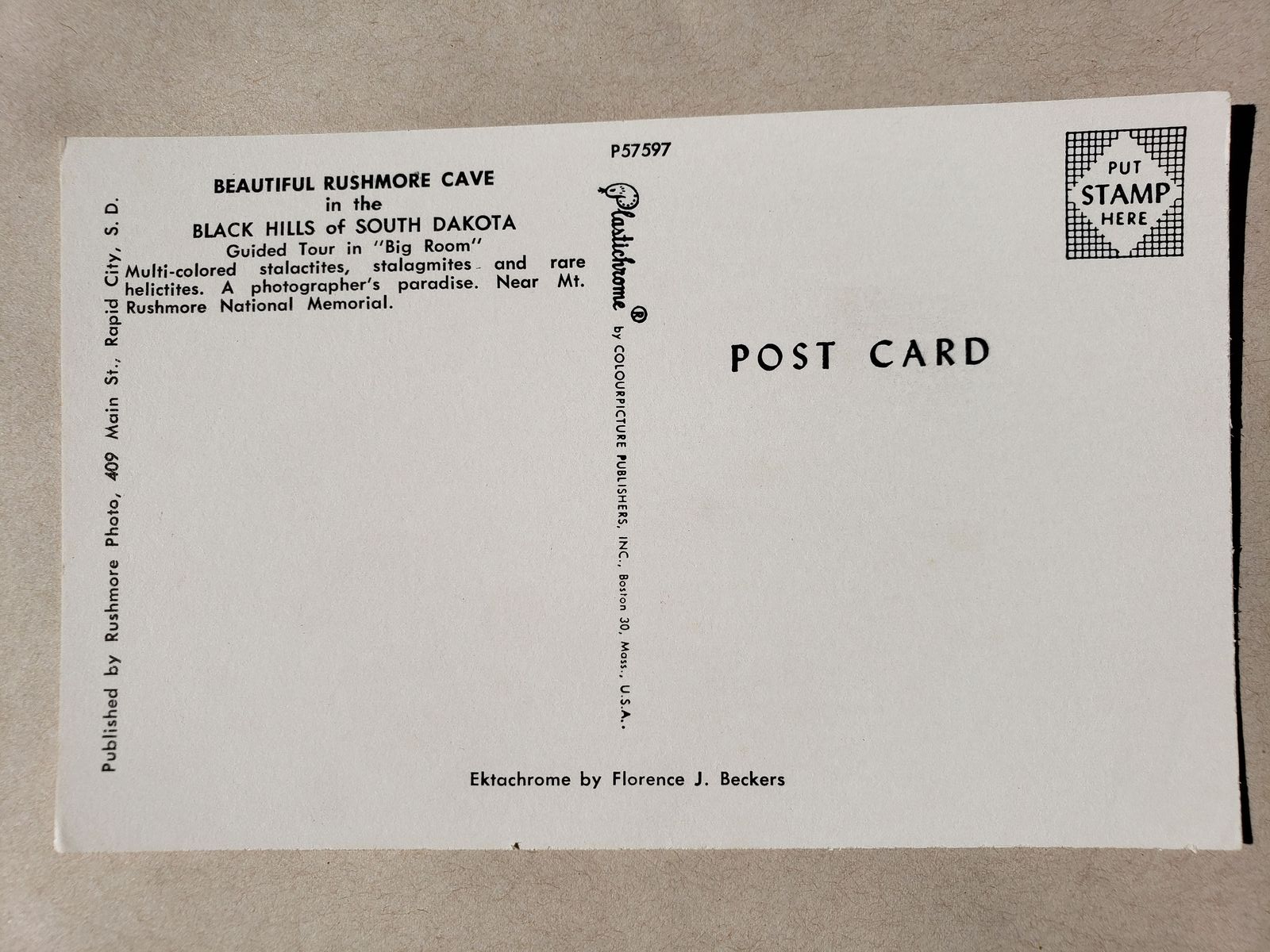 Up for sale is a vintage postcard by Colourpicture Publishers . It has a colour picture of a tour group going through the big room area inside the Rushmore Caves in the early 1960s. What a great addition to any collection.
