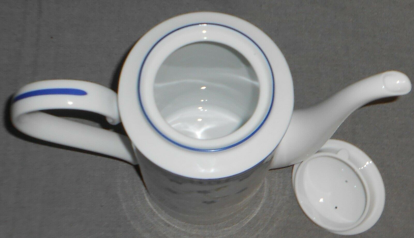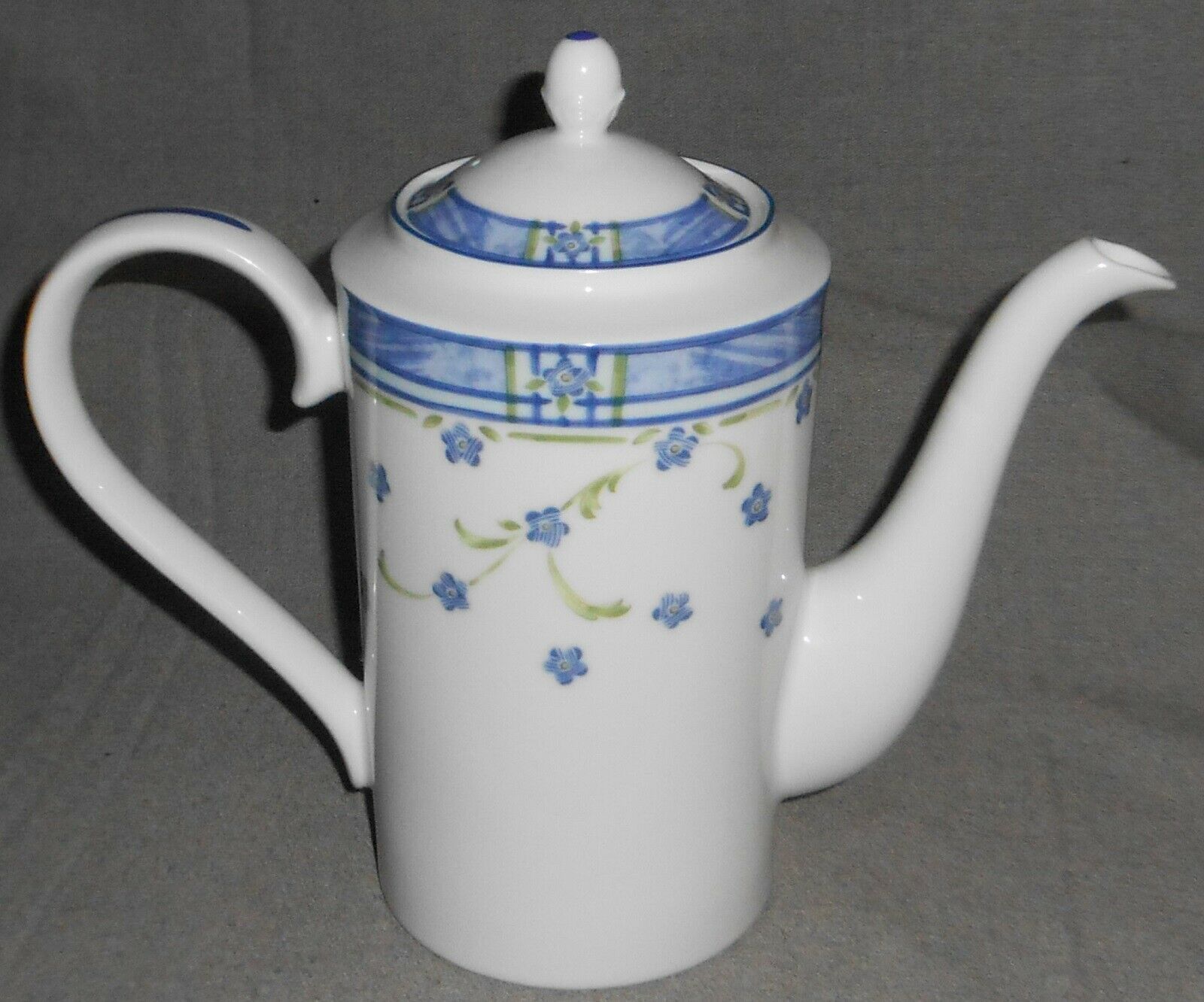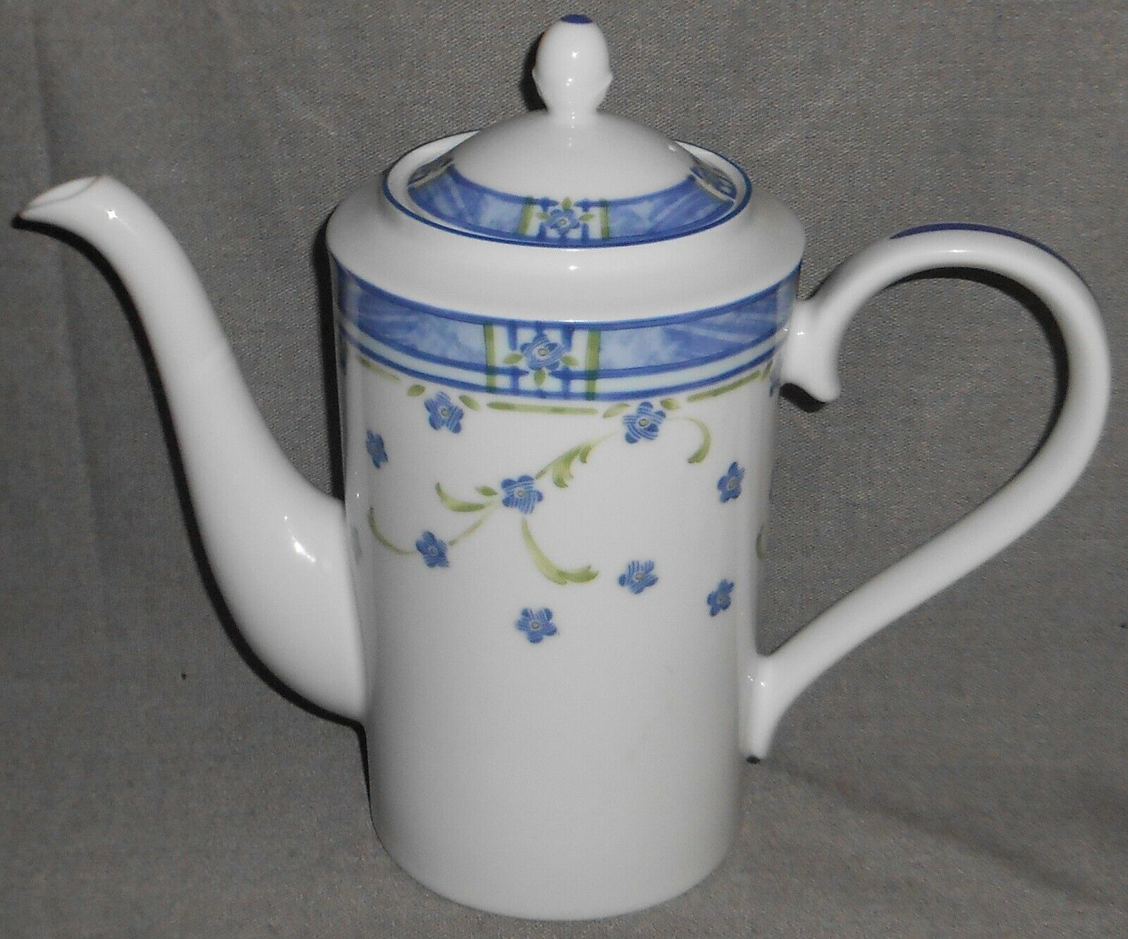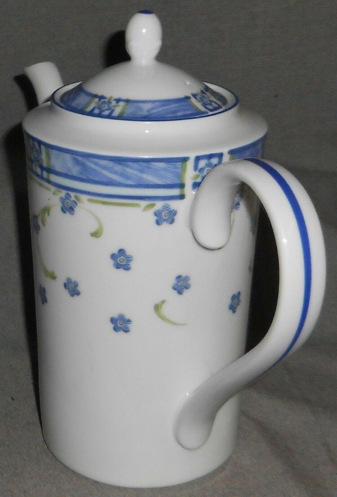 This is the Six Cup Coffee Pot w/Lid that measures approx 9 1/4" tall w/Lid on to Top of Finial x approx 11 1/4" across from handle to spout at widest points from Noritake Impromptu in the Spanish Flowers Pattern. It is in great pre-owned condition with no chips or cracks.