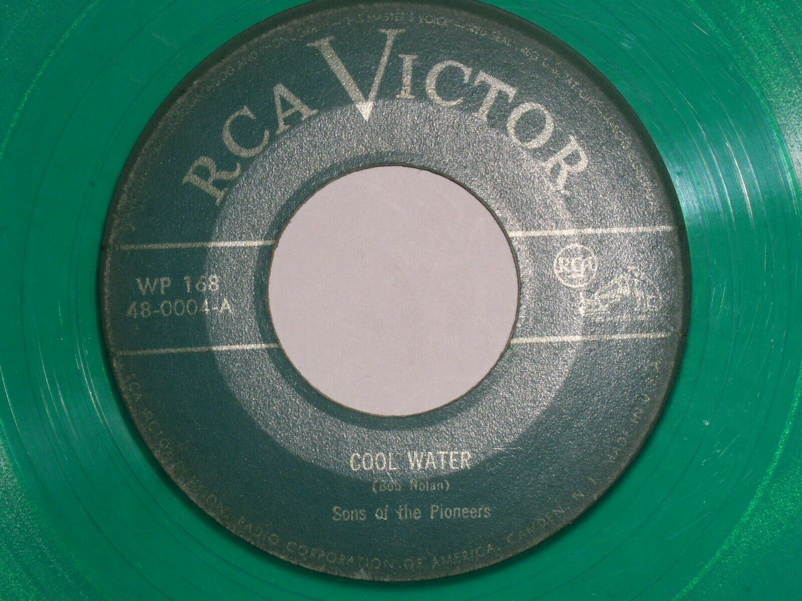 This is an original, vintage green vinyl 45 rpm phonograph record by Sons Of The Pioneers entitled, "Cool Water". Flipside: "Chant Of The Wanderer". Record label RCA 48-0004.
