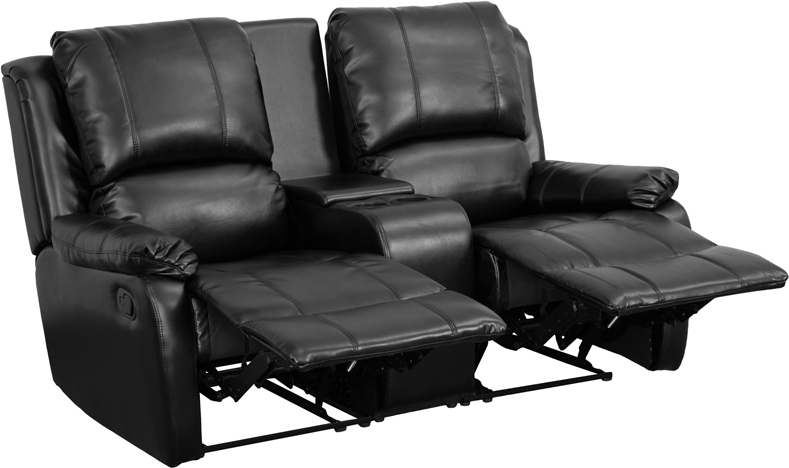 Spend some quality time with your family and friends for memorable movie nights, epic game days and legendary video game marathons, relaxing on this black home theater seating unit boasting soft and durable LeatherSoft upholstery. The ultimate in contemporary home theater seating, it features 2 recliners with recessed levers with generous amounts of foam padding in the back and seat. The seat back has an integrated headrest for extra comfort. This recliner unit has cup holders for your favorite beverages, and a storage console for remote controls, magazines and game controllers. Plastic floor glides protect your floor by sliding smoothly when you need to move it. When you have home theater seating, you can make every game day an event that rivals the Big Game; treat your friends to a cinematic experience; and challenge your friends and family to a virtual duel! You can setup as many rows as needed to fill up your desired space. [BT-70295-2-BK-GG] Dimensions: 63"W x 35" - 66"D x 40"H