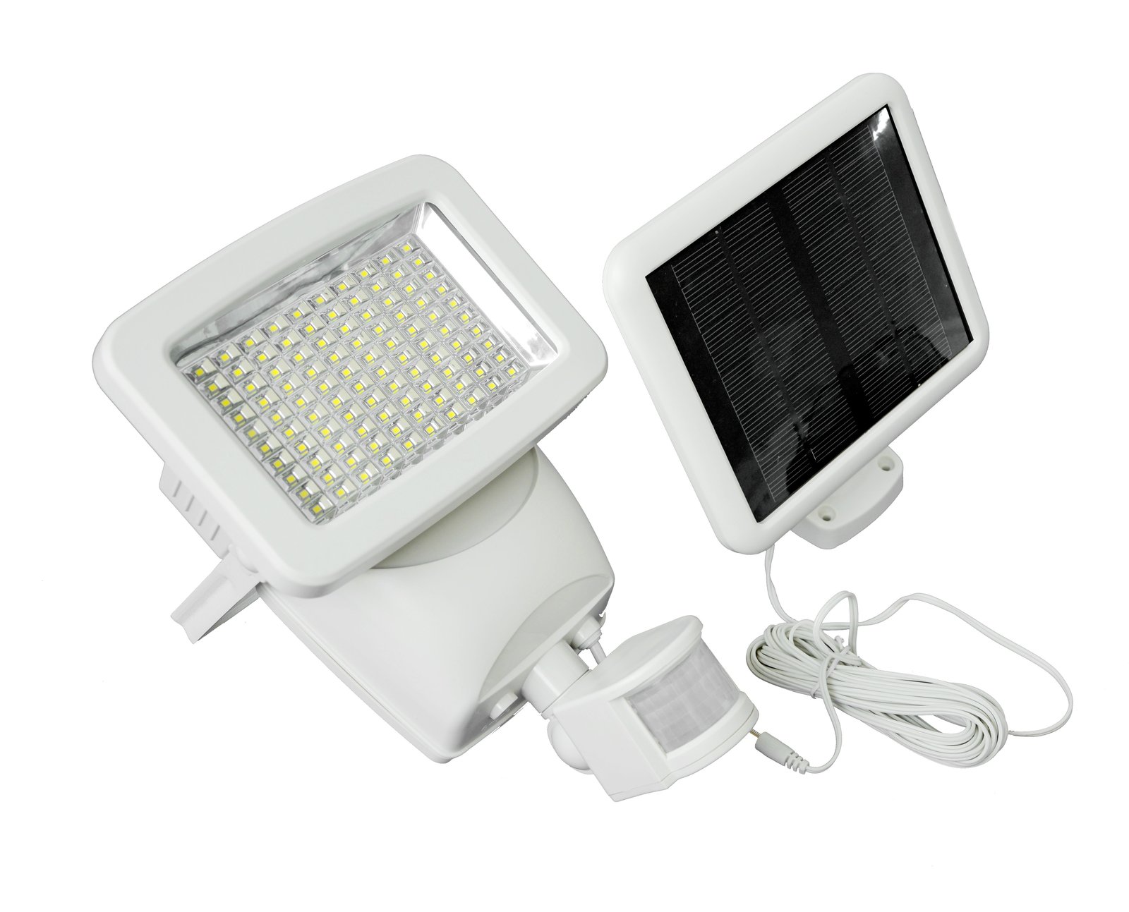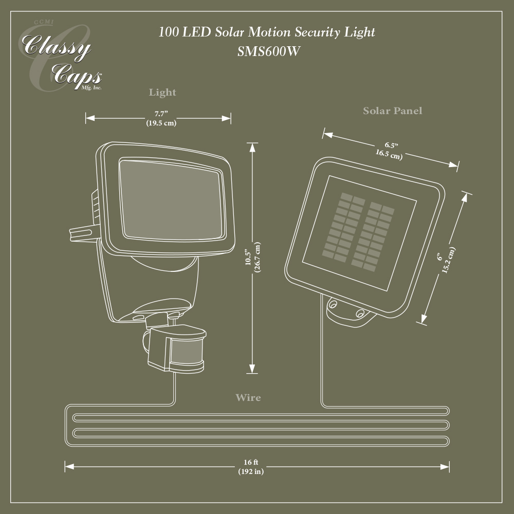 Classy Caps 100 LED's super bright Solar Motion Sensored Security light is sure to effectively illuminate any outdoor area such as your home, business, driveway, parking lot, loading dock and entrance way. With its 180 degree motion sensor detection range up to 10 meter (30 ft) detection distance this powerful 600 Lumen bright white solar motion sensored security light is adjustable and will stay on for a time range of 10 seconds to 2 minutes. The solar panel can be mounted up to 4.5 meters away from the light fixture. Installs easily with included wall mount and hardware.