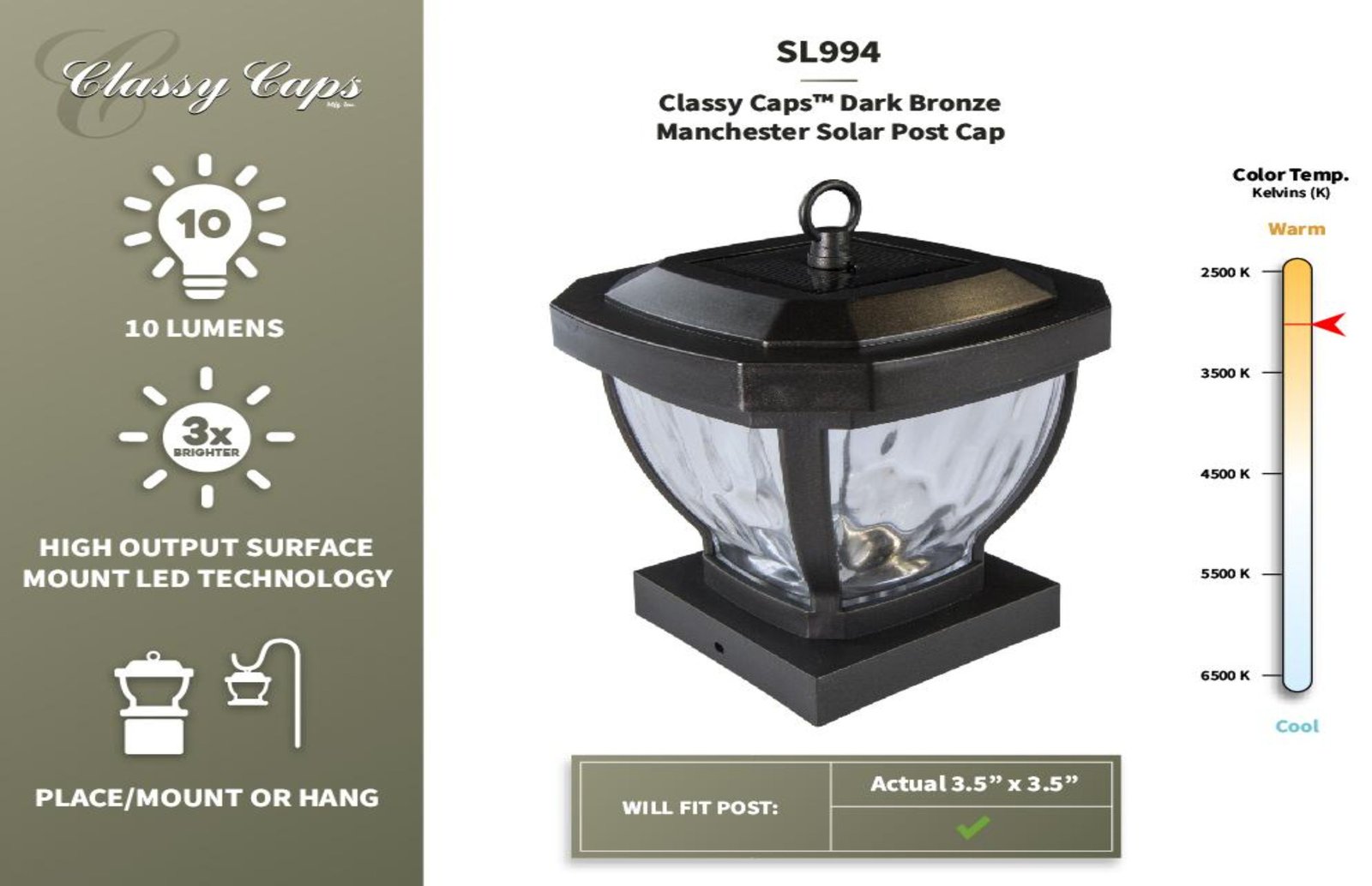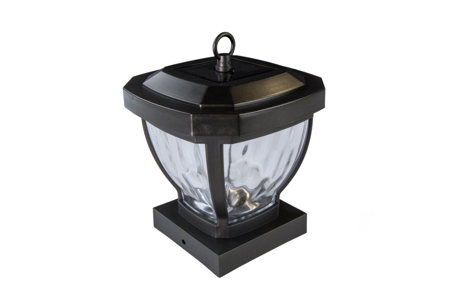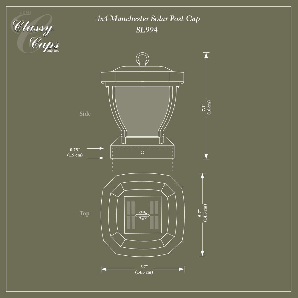 The stylish 4"x 4" Manchester solar post cap is manufactured using real water glass . It will cast a warm, elegant array of light onto the post and surrounding area. This crafty design can be used not only for a post, but it can also be hung on a hook or placed on a table. Will fit over an actual 3.5"x3.5" post (post hook not included).