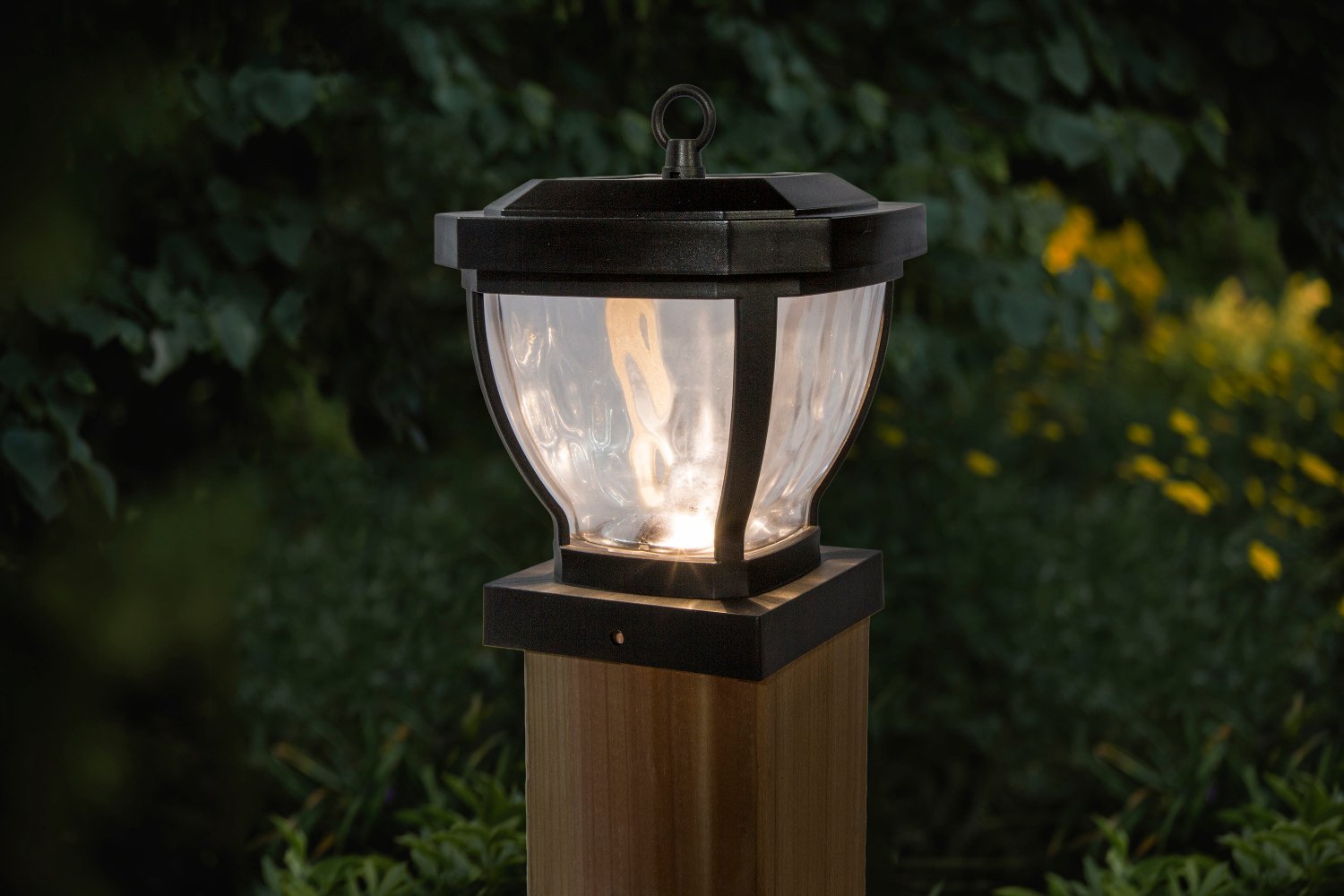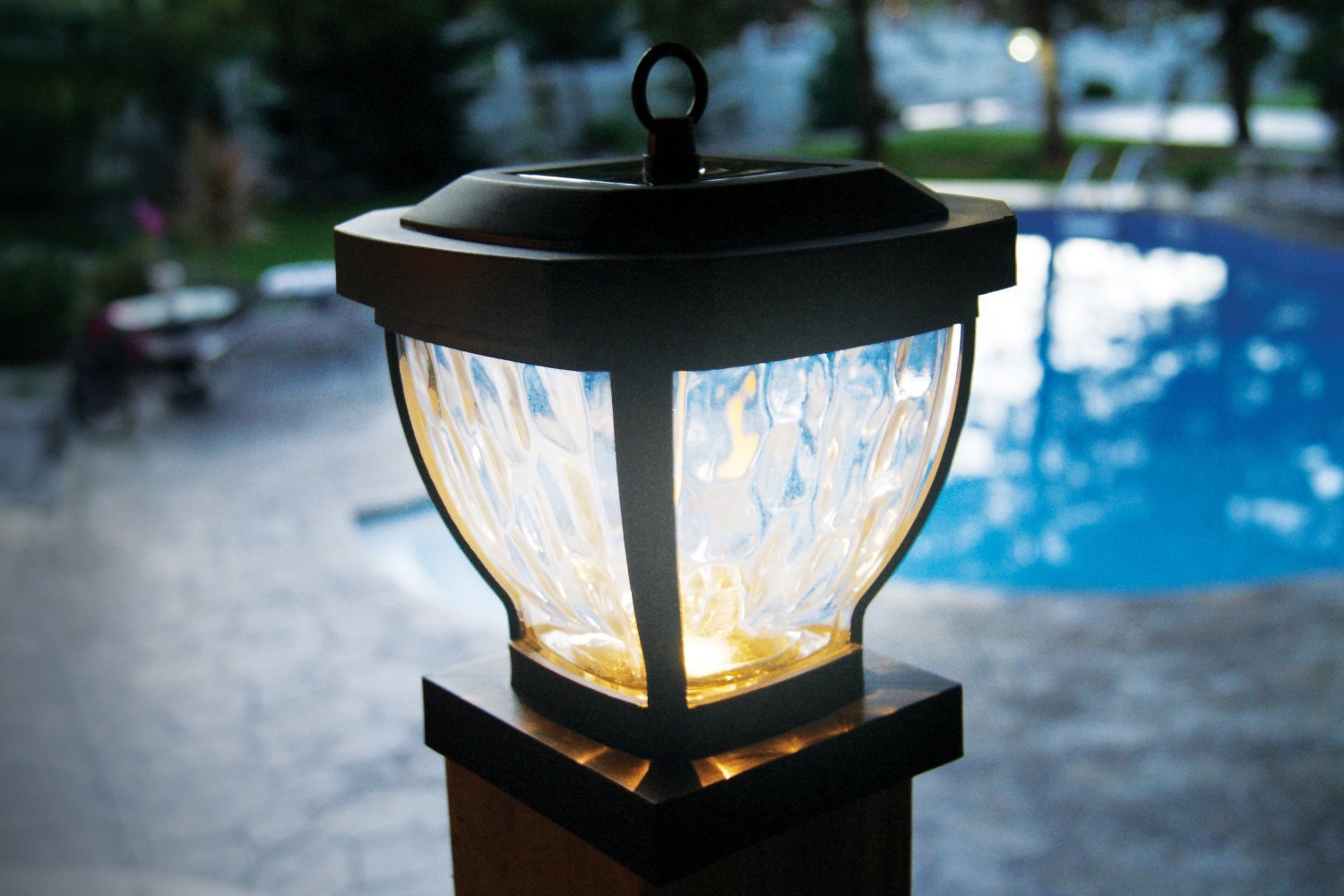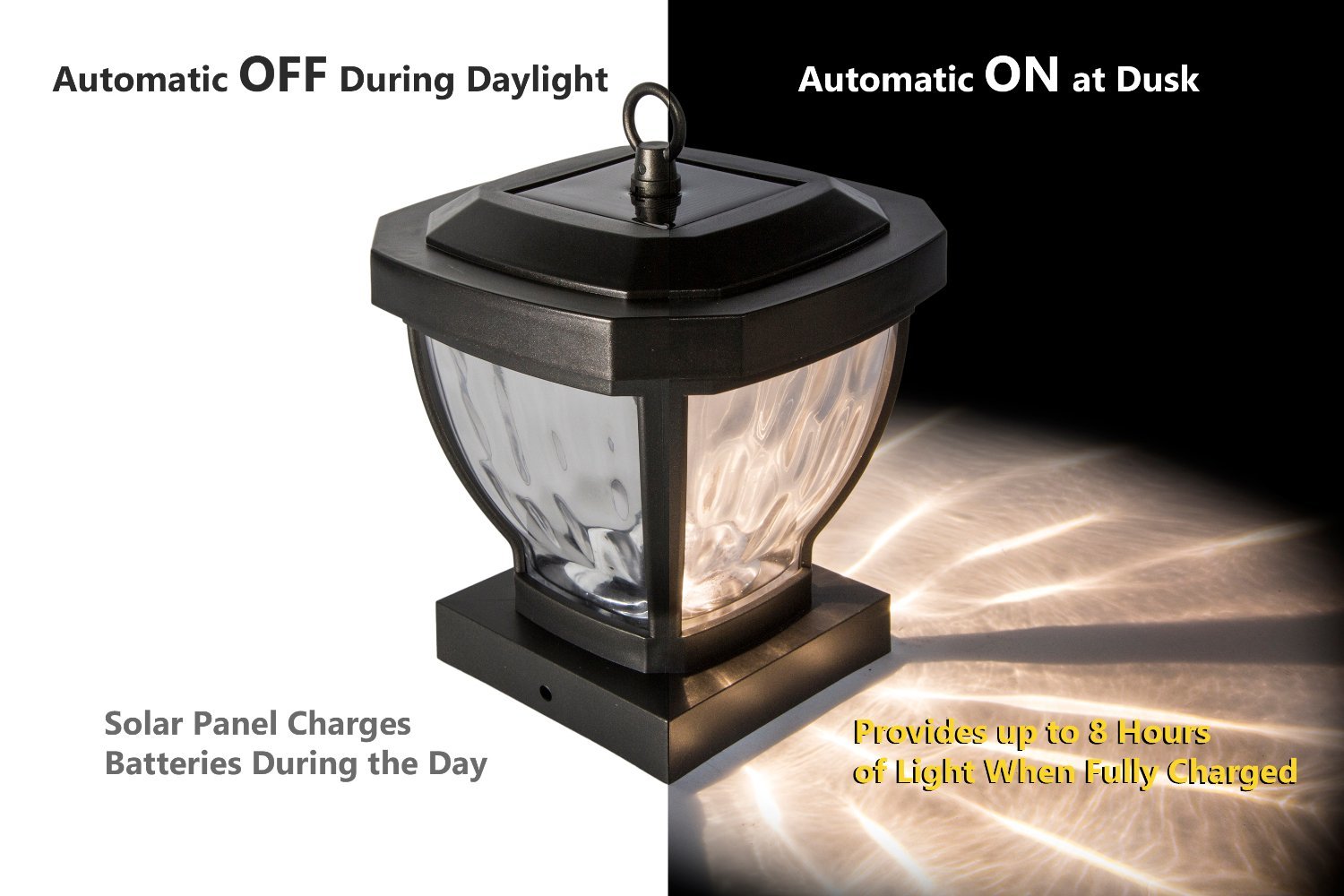 The stylish 4"x 4" Manchester solar post cap is manufactured using real water glass . It will cast a warm, elegant array of light onto the post and surrounding area. This crafty design can be used not only for a post, but it can also be hung on a hook or placed on a table. Will fit over an actual 3.5"x3.5" post (post hook not included).
