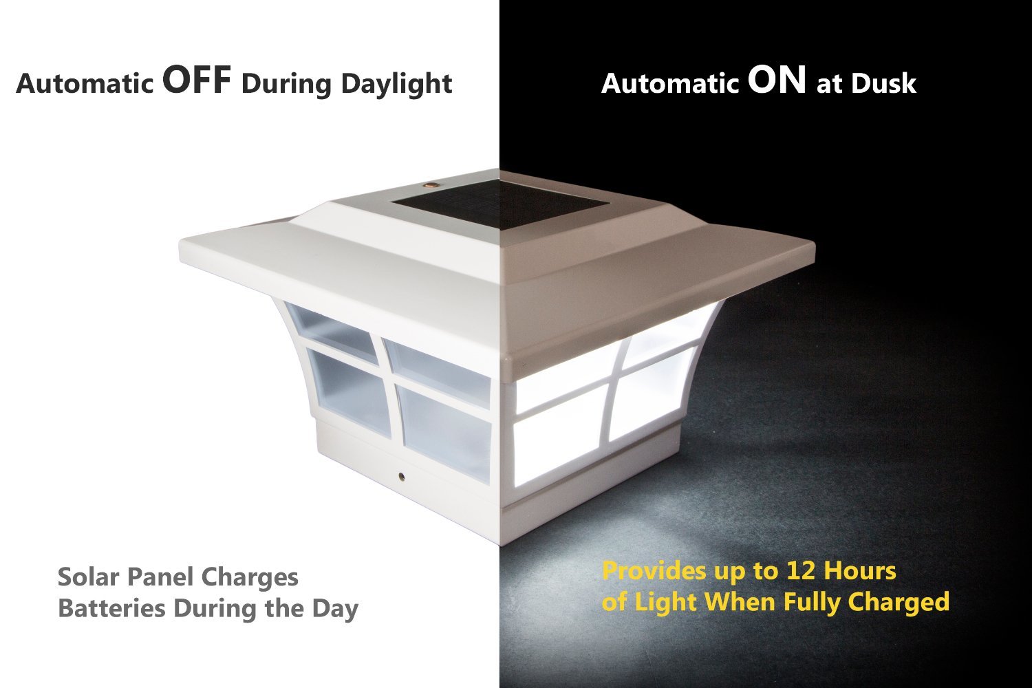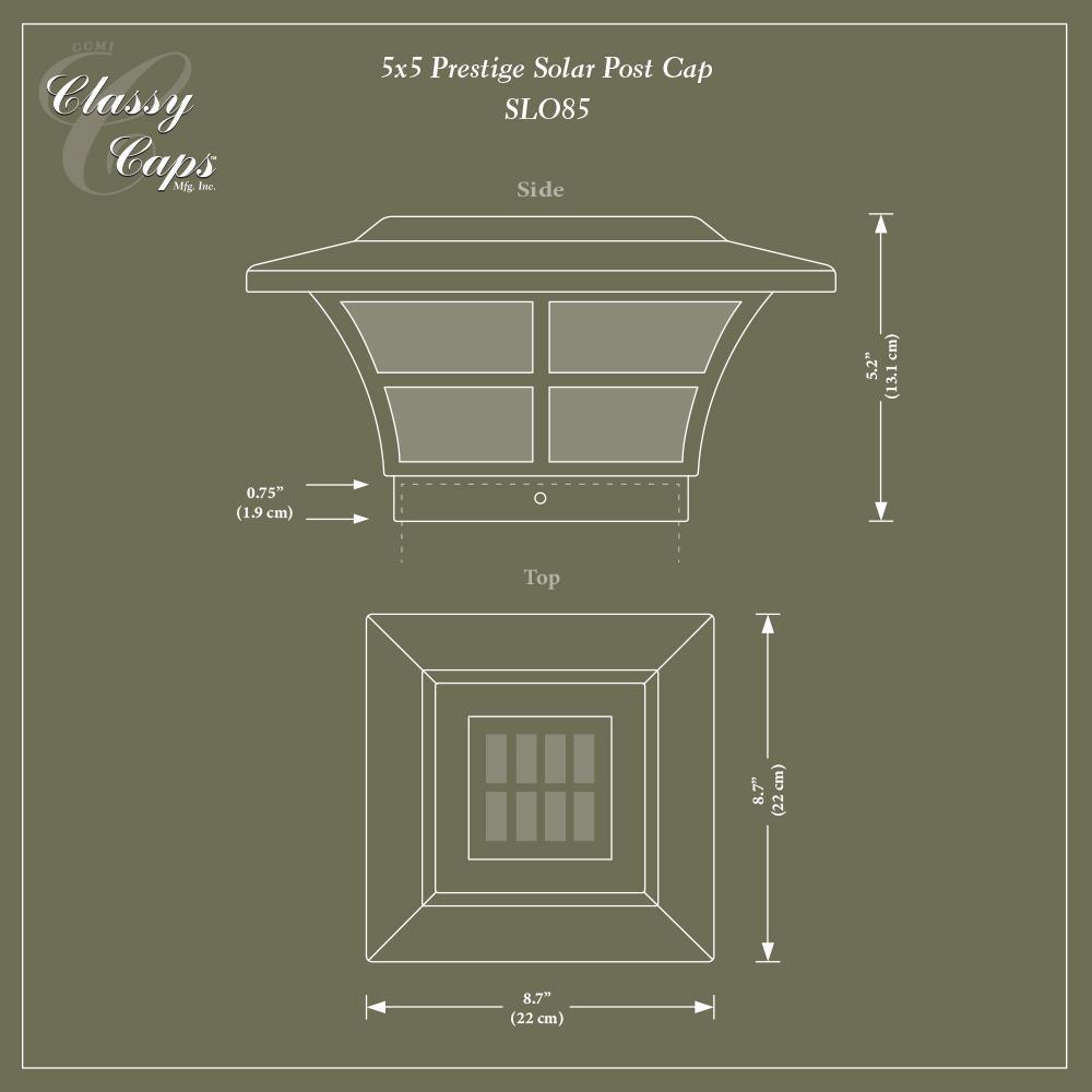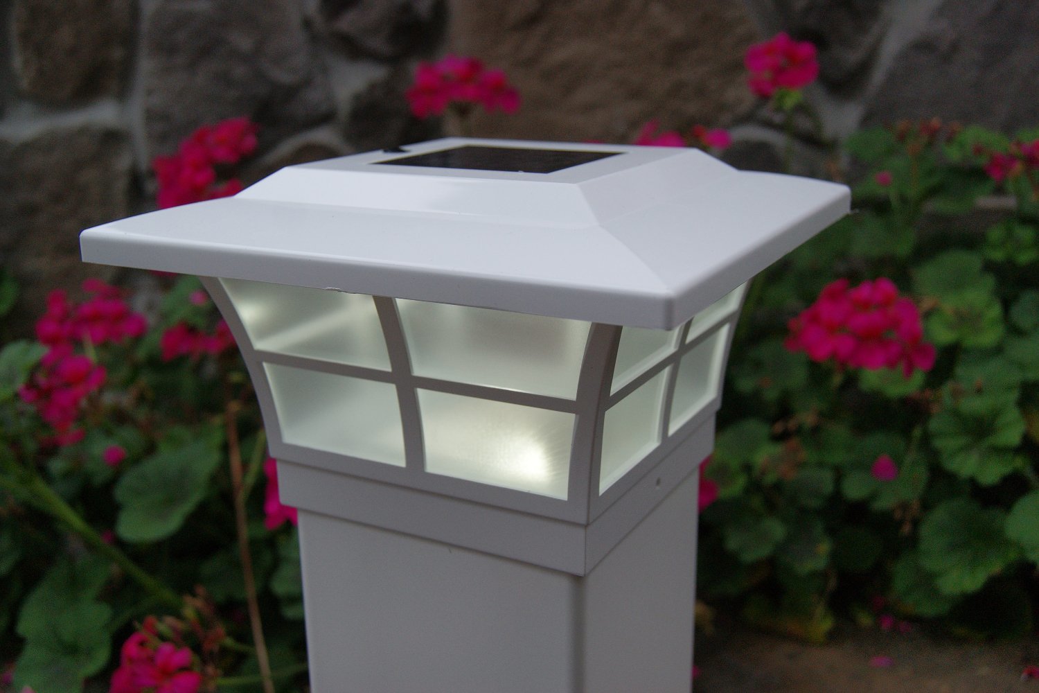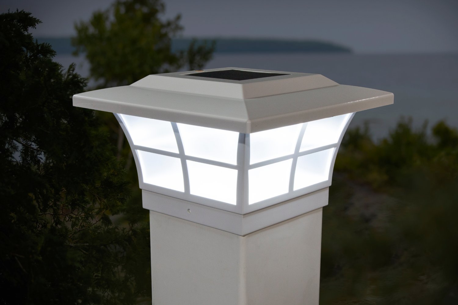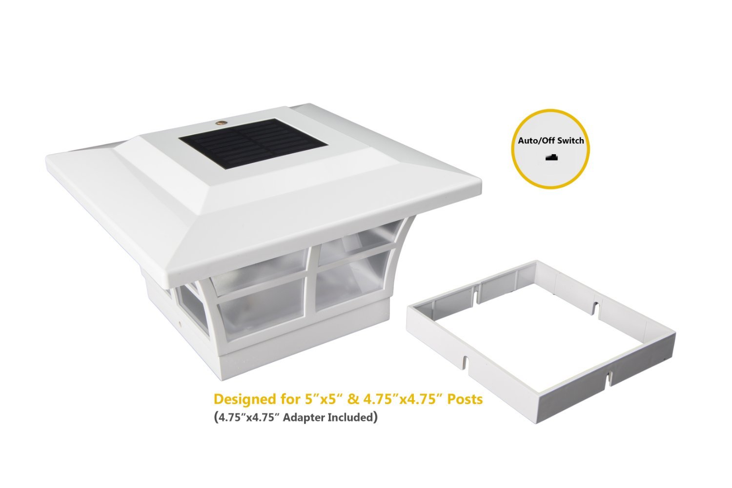 The 5x5 white PVC Prestige solar post cap is stylish and durable with performance you can depend on. Our patented window frame design and frosted lens create a unique ambiance. Will fit over an actual 5"x5" or 4.75"x4.75" post (4.75"x4.75" adapter included)