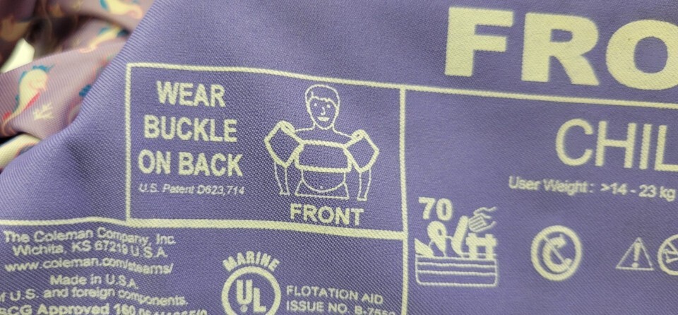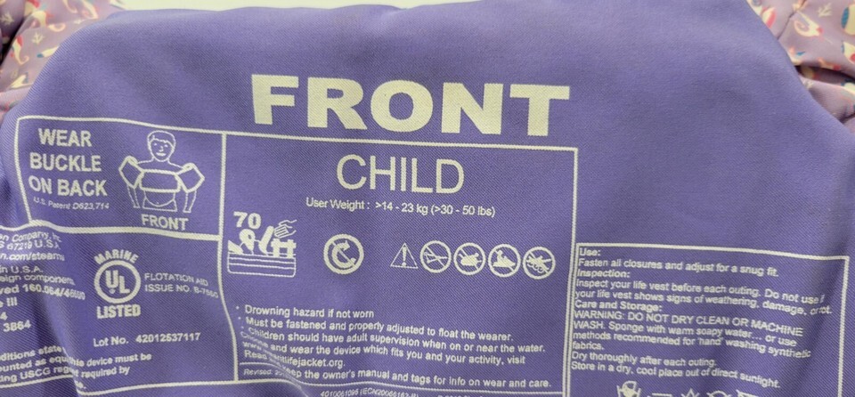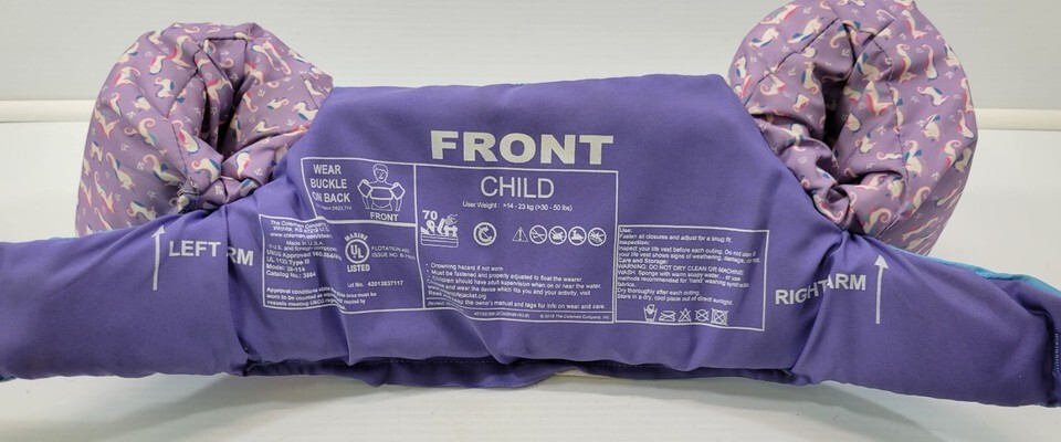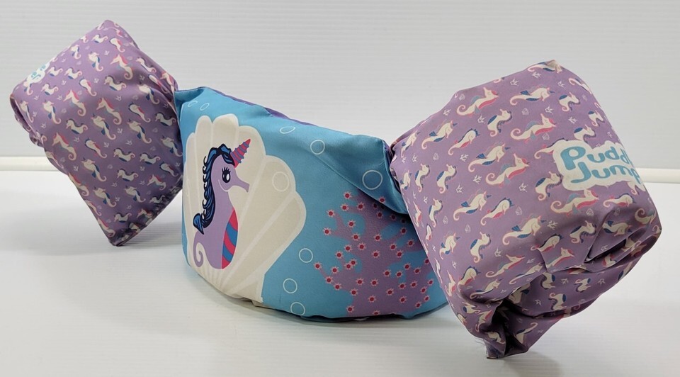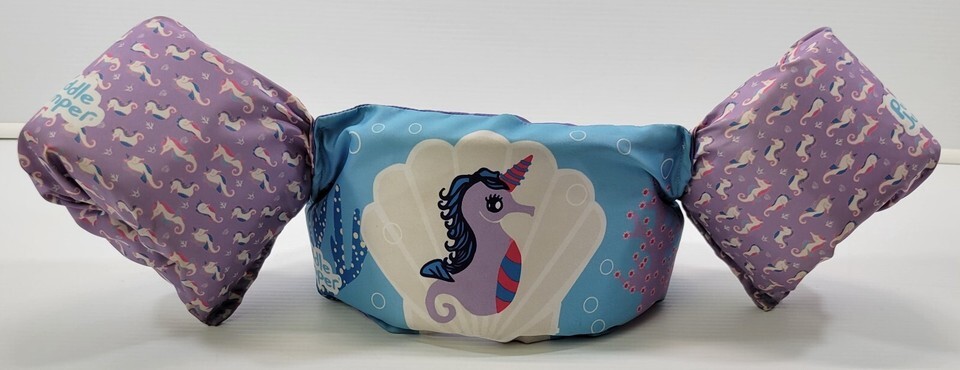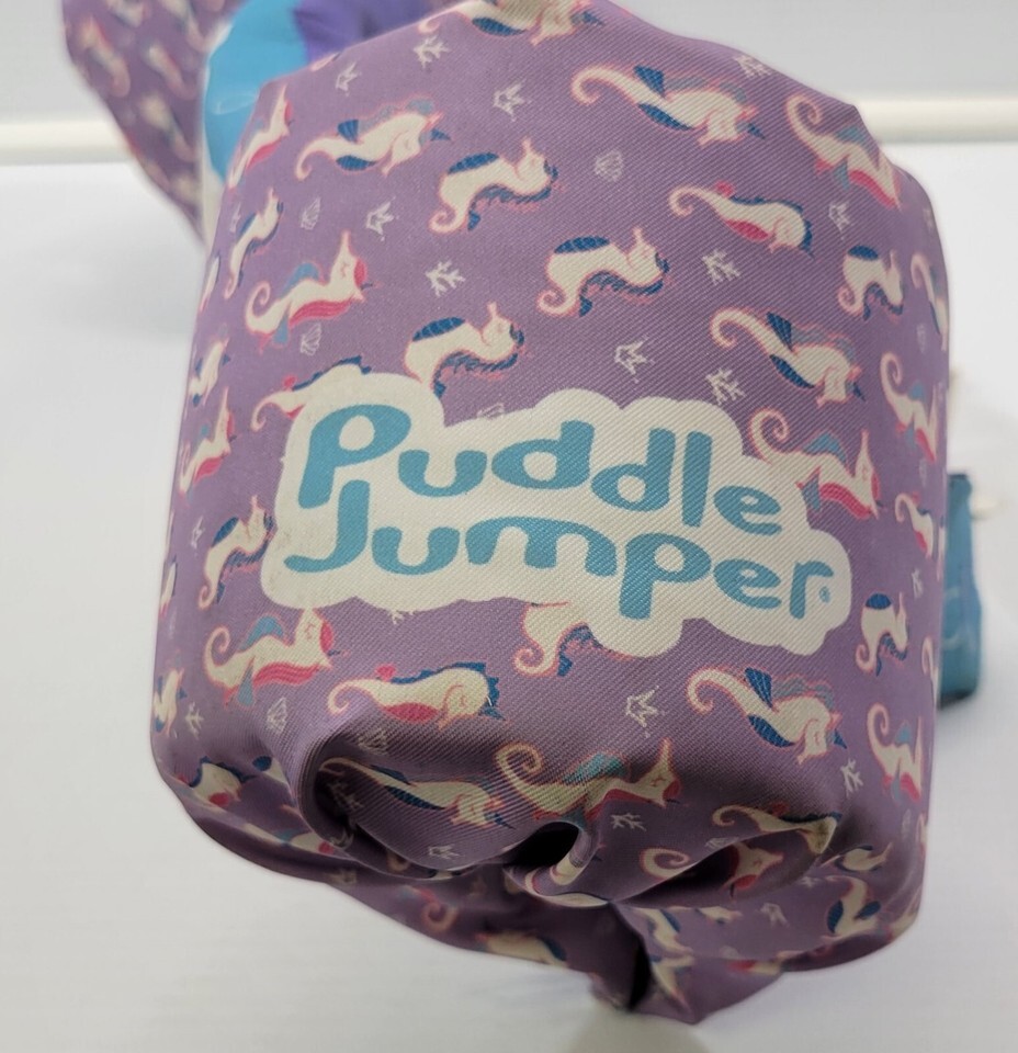Puddle Jumper Child Flotation Aid Child Type III 30-50lbs Purple/Blue/Seahorse Model 29-114 Vest is in good, slightly used condition.