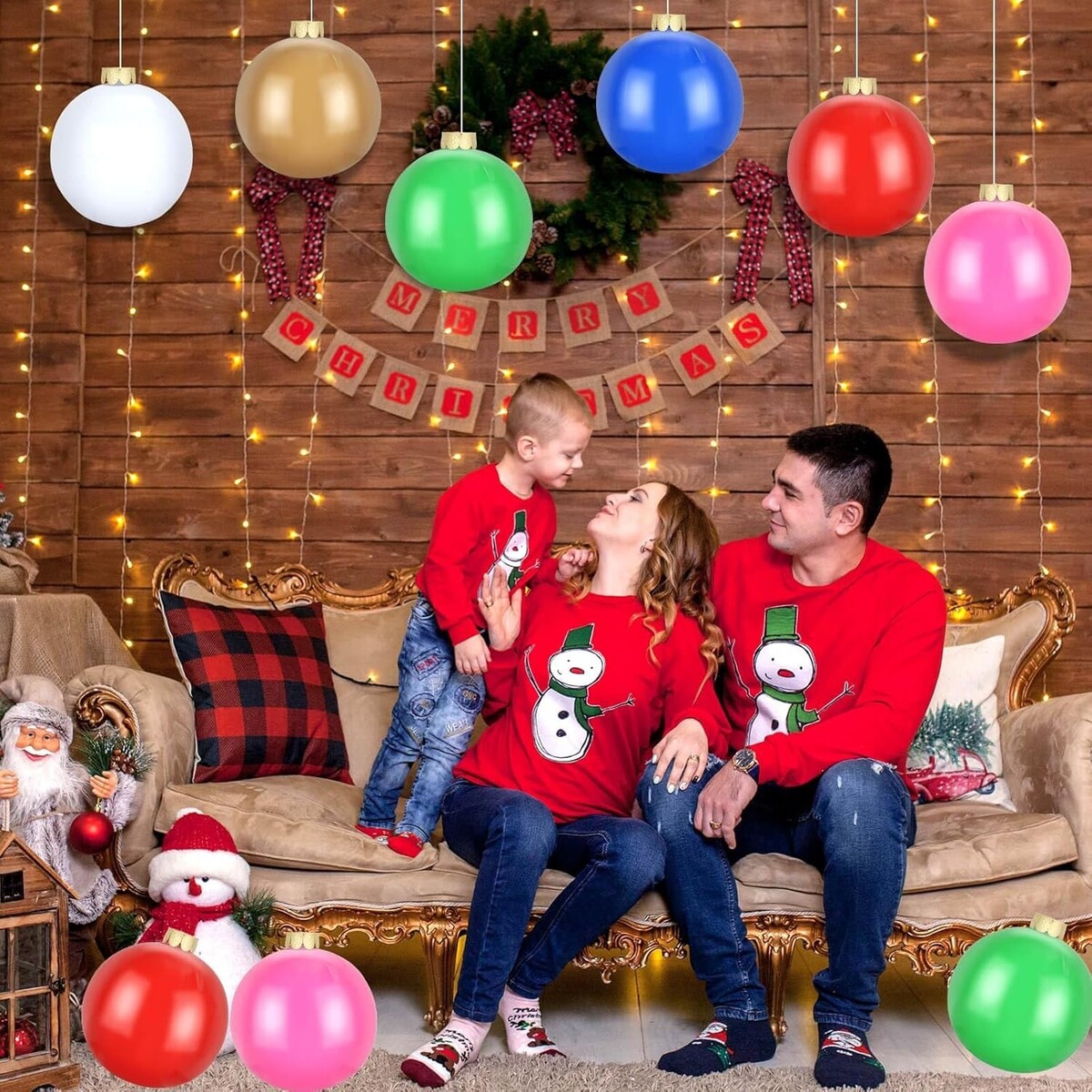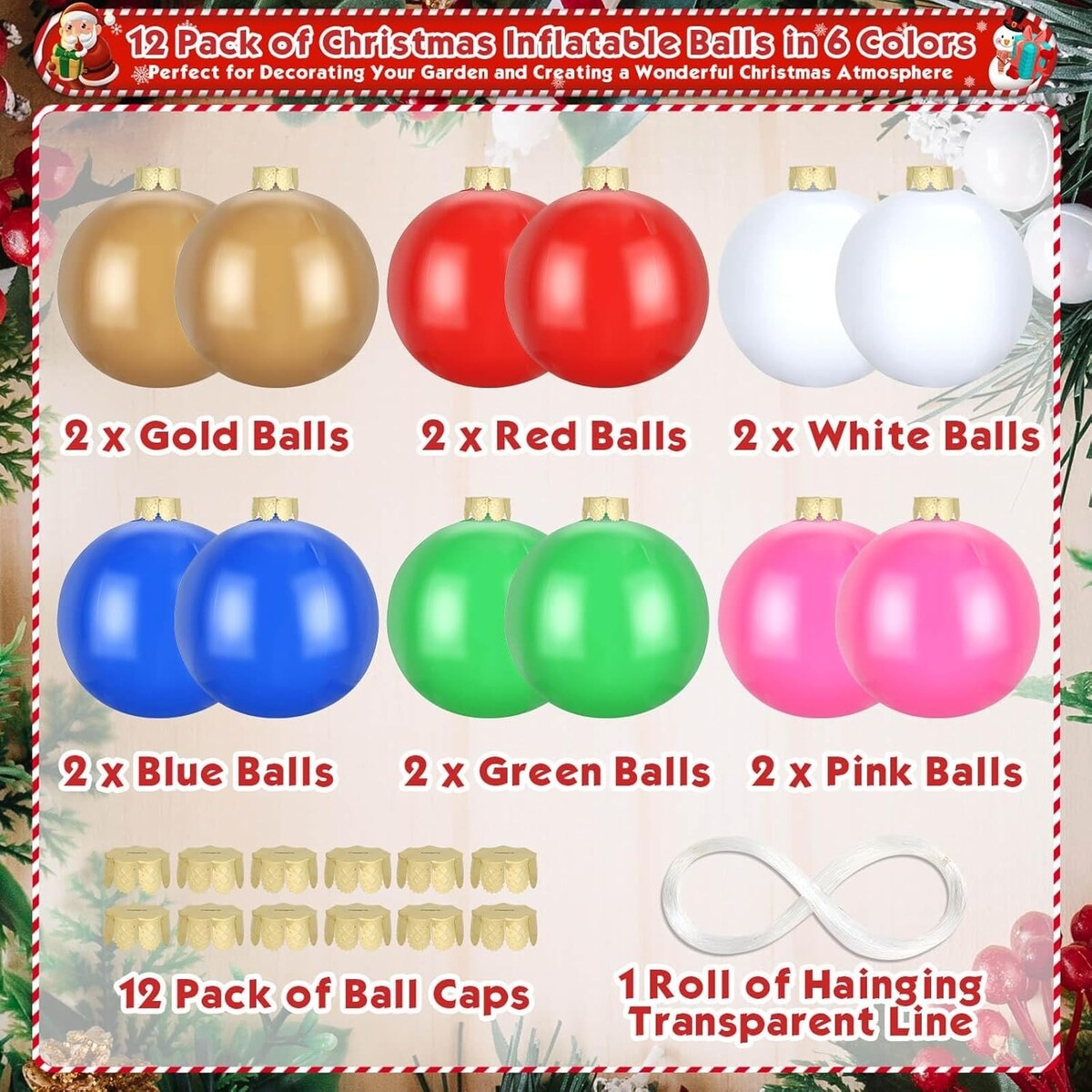 Flasoo large Christmas ornaments kit comes with 12 x inflatable balls, 12 x ornaments caps, 1 x clear hanging string. Great for decorating your home and patio for a festive look!