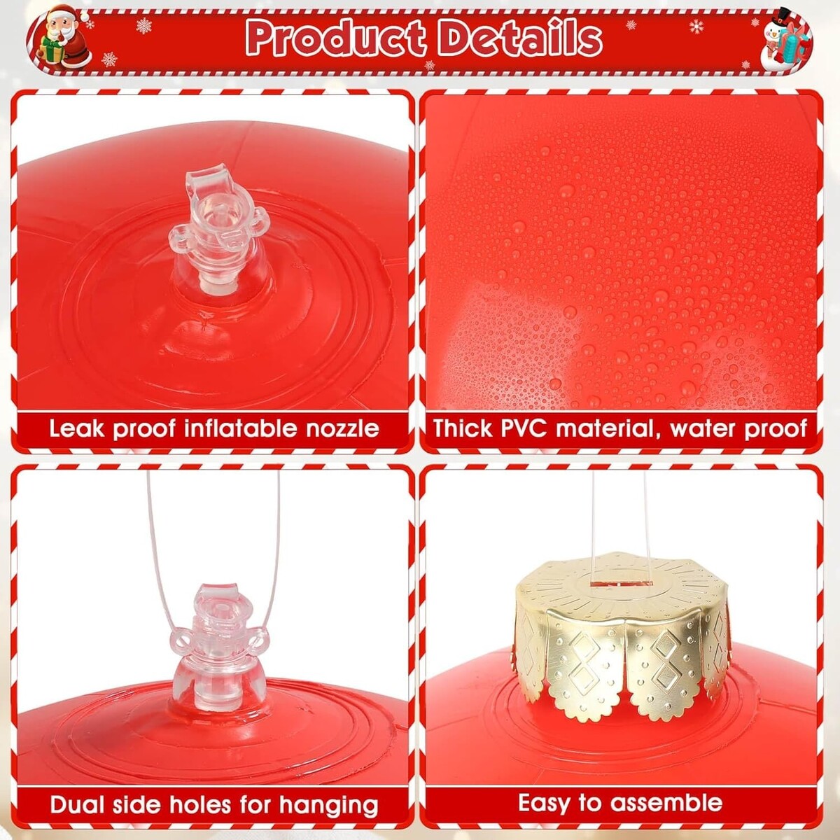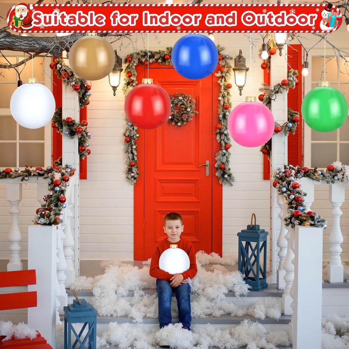 Our inflatable ball decorations are ideal for outdoor trees, patios, lawns, porches, gardens, front doors, pools or windows, and you can also use them as decorations for winter parties and Christmas themed parties.