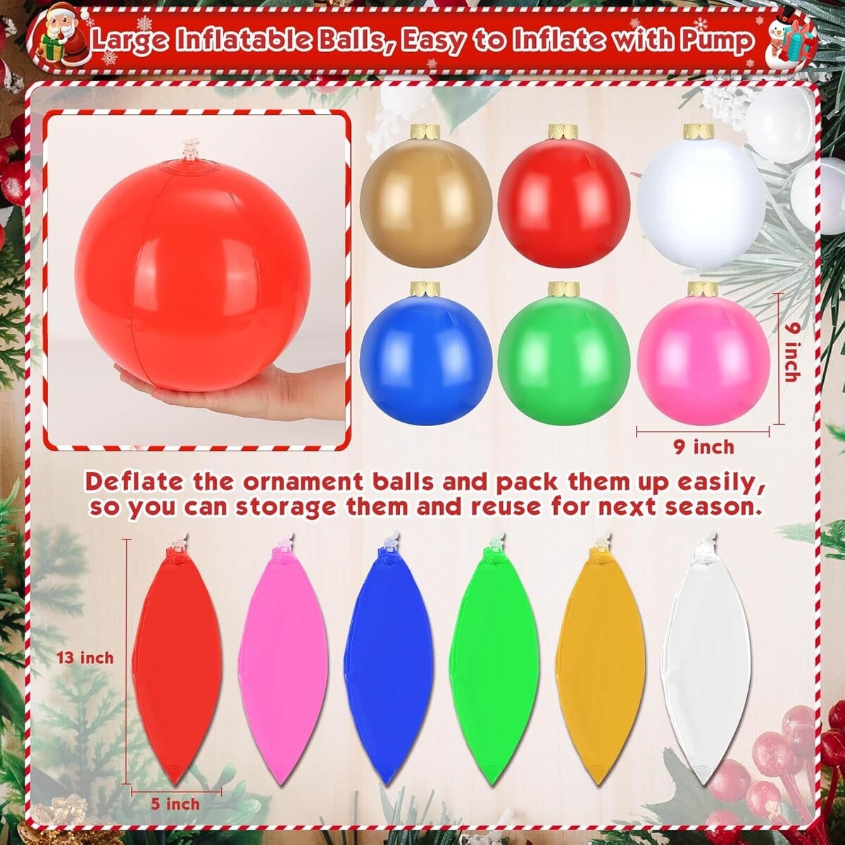 The Christmas inflatables measure 9 inches in diameter when Inflated. They come in six colors, two of each color. Large size Christmas balls in bright colors are the best choice for decorating your yard and house!