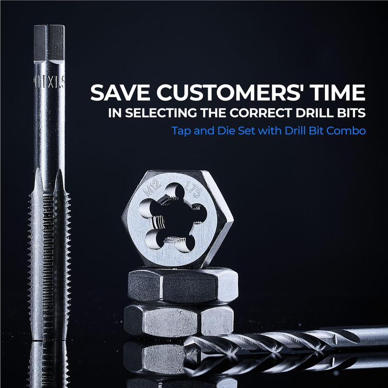 The set includes drill bits matched to the tap sizes, eliminating the need to reference charts or check drill-tap compatibility during work. This prevents sizing errors, increases threading accuracy, and improves workflow efficiency.