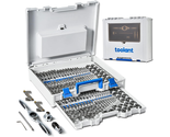 A structured storage box with two layers keeps accessories separated and protected. Assigned compartments ensure all taps, dies, drill bits, and ratcheting tools remain organized and easy to access.
