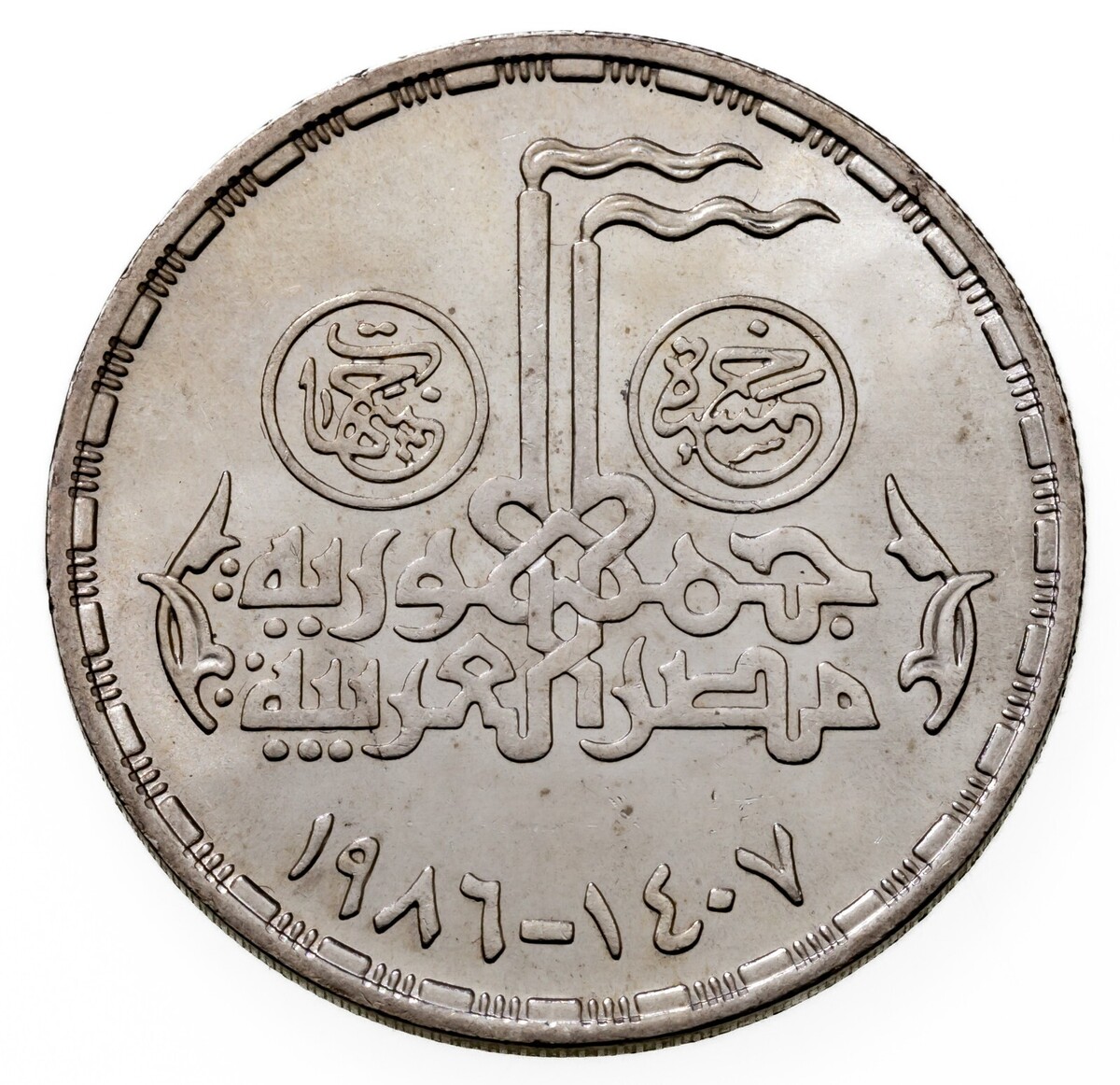 - 1407-1986 Egypt 5 Pounds Silver Coin in BU, 30th Anni. Egyptian Industry KM 616
