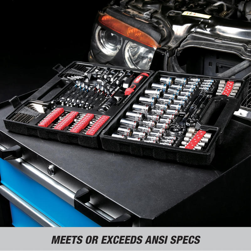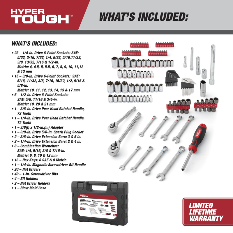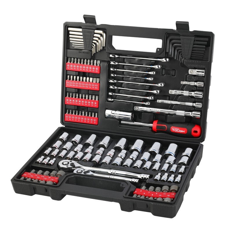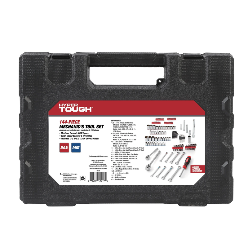 Hyper Tough 144-Piece 1/4, 3/8 and 1/2-inch Drive Mechanics Tool Set, Chrome Finish Meets or Exceeds ANSI Specs Color-Coded Sockets and Wrenches Includes 1/4, 3/8 and 1/2-inch Drive Sockets Convenient molded case for storage and transport Includes pieces in both metric and SAE sizes for working on foreign or domestic cars Ideal for auto mechanics or everyday DIY car and home repairs Visible stamped sizes make it easy to quickly find what you need New