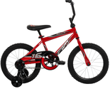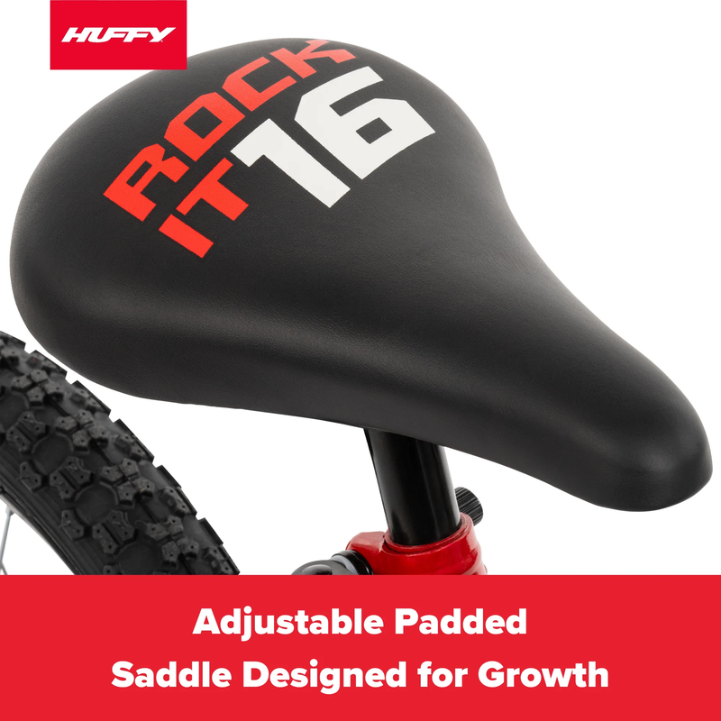 The Huffy Rock It 16" Boys? Bike is perfect for adventurous young riders aged 4 and up. Its bold red design with energetic graphics gives the bike a dynamic look, while the durable steel frame ensures lasting strength. The padded seat and handlebar pad provide extra comfort, making every ride more enjoyable. Assembly is quick and easy, so your child can start riding right away. This single-speed bike is built for fun, whether cruising through the neighborhood or exploring the park. Designed for style and durability, it?s an excellent choice for any young adventurer ready for action. The bike also features sturdy training wheels to help beginners gain confidence as they learn to ride. Parents will appreciate the quality and safety features, while kids will love the freedom and excitement it brings. From Huffy, We Make Fun!