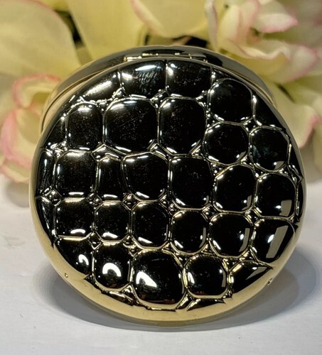 2x This Estee Lauder compact is a stunning addition to any vanity or collection. The gold reptile alligator design adds a touch of luxury, while the Lucidity model ensures a flawless finish. Measuring at 2-3/8" x 1/2" exterior size, this compact was made in the United States and is part of the 1980-Now collection. Although the compact is empty, it is still a beautiful piece to display or use as a refill.