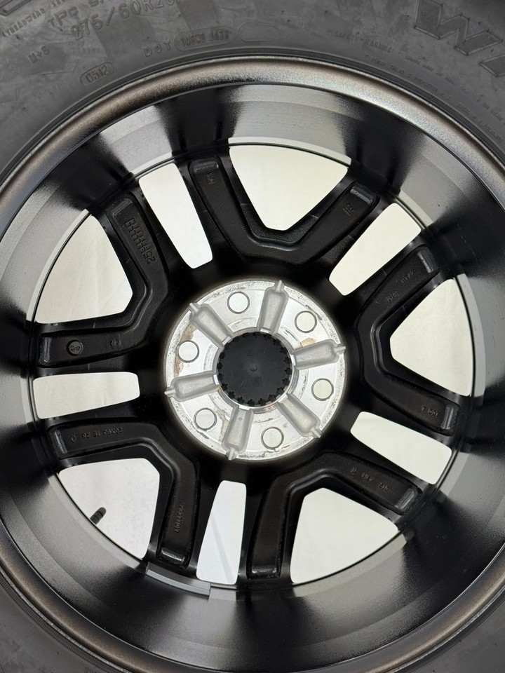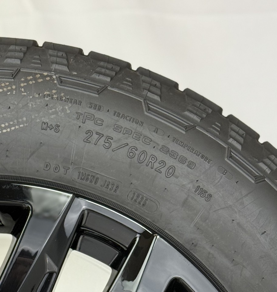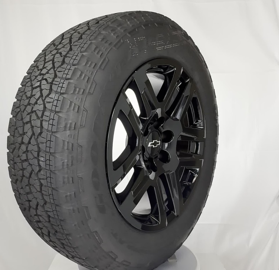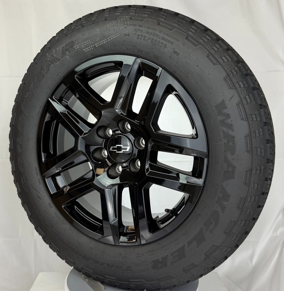 Set Of Four New Takeoff Chevy Silverado Gloss Black Trail Boss 20" Wheels With 275/60R20 Goodyear Wrangler TrailRunner All Terrain Tires. These were removed from a new vehicle to install larger wheels and tires with less than 25 miles.