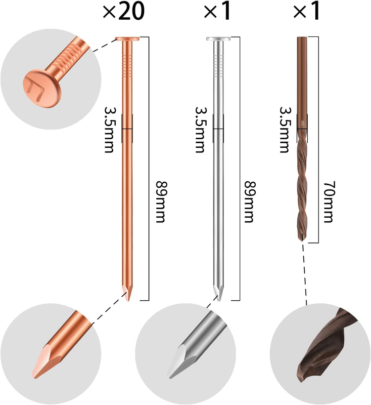 Package includes: 20PCS high quality copper nails, 1PC drill bit, 1PC steel nail