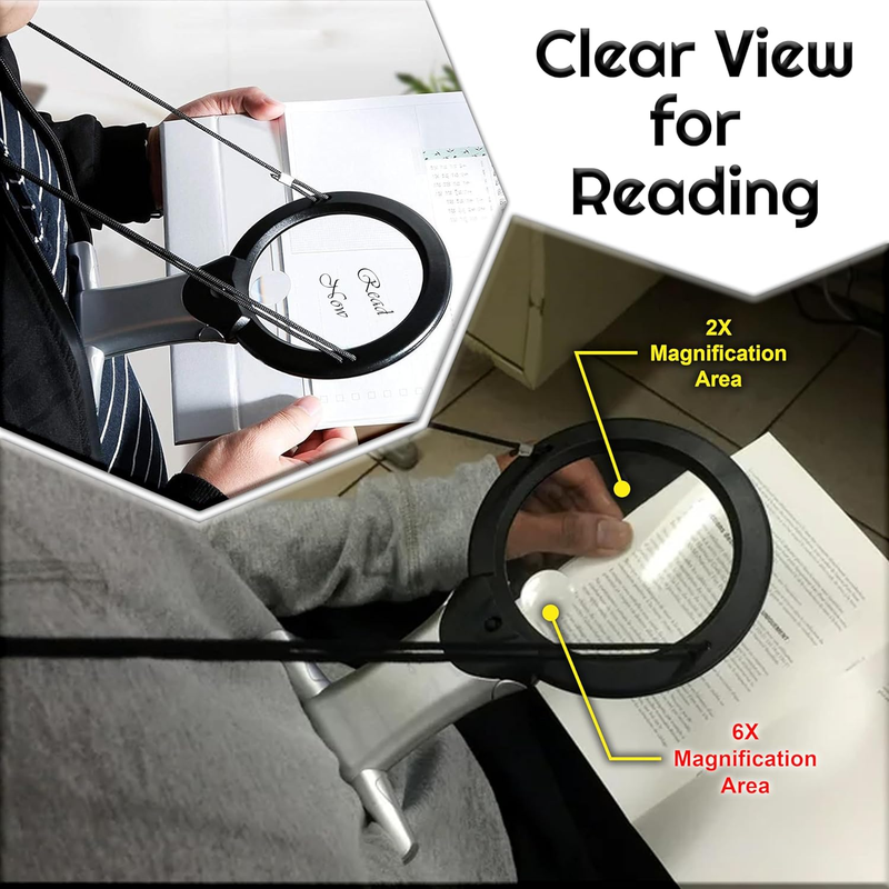 ? Dual Magnification for Every Detail ? Experience clarity like never before with a 2X full-page lens and a powerful 6X spot magnifier for the smallest details. This hands free 2x and 6x magnifier glass adjustable neck strap to hang, and flexible stand, is perfect for reading newspapers, sewing, crafting, and precision work. Paired with bright LED illumination, this craft magnifier with light hands free ensures distortion-free viewing in any lighting condition