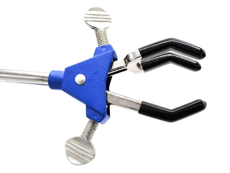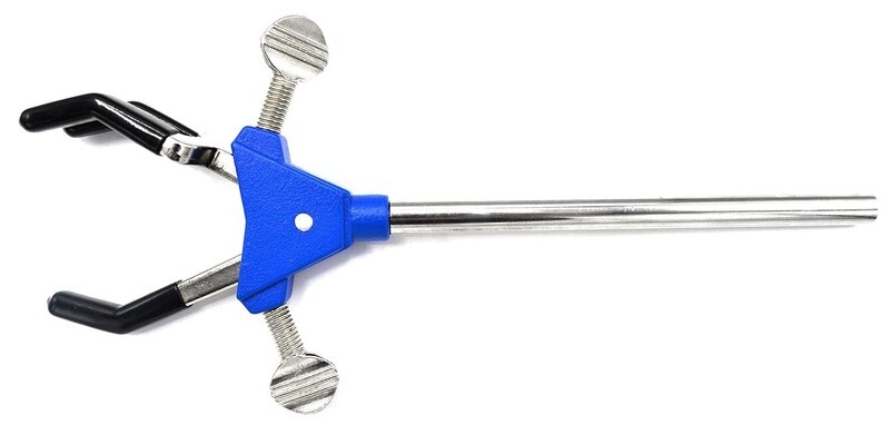 Universal, three prong adjustable clamp - perfect for holding both regular and irregular shaped glassware. Accommodates objects up to 2.2" in diameter. Two adjustable thumb screws on either side of the clamp allows for a wider range of accommodation. Non-slip vinyl coated rubber prongs allow for maximum grip and traction. Clamp measures 9.75" in total length, and 4" in width (when closed). Rod measures 10mm in diameter.