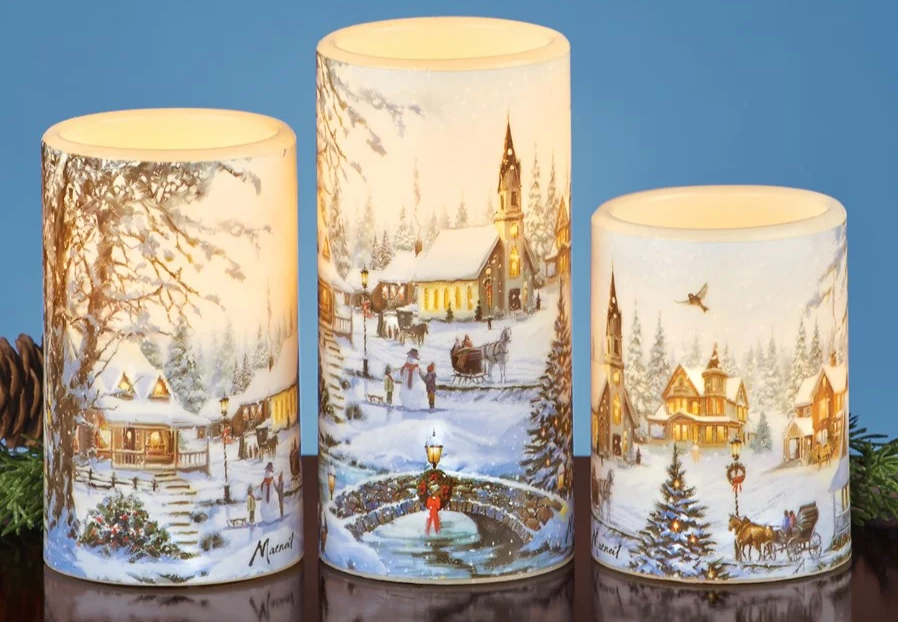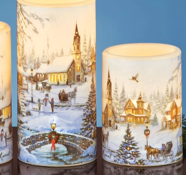 This beautiful set of 3 LED candles features artwork by The Macneil Studio of a beautiful, snow-covered village decorated for the holidays. The lights inside these battery-operated candles flicker like real candlelight without any open flames. These look beautiful in our Candle Holders sold in our store! Plus the more you buy, the more you SAVE!