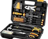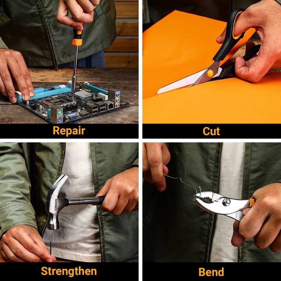 About this item VERSATILE HOME KIT: 30 pcs bits and a complete box fasteners also provide a richer experience. This is a perfect tool box for college students, essential household DIY, household repairing, basic maintenance and woodwork etc. HIGH QUALITY STANDARDS: Forged from high-quality steel and finished in high-polish chrome, all the tools have better strength, durability, and anti-corrosion protection. EASY STORAGE PORTABLE: The tool box is compact and light enough to store in your locker or utility room at home, but also in the trunk of the car for outdoor use. USER-FRIENDLY DESIGN: The plastic and rubber non-slip handle of tools is easy to grasp with texture, providing comfort and safety when using. INCLUDES::8pcs professional-grade hex key wrenches, slip joint pliers, 30pcs bits, bits screwdriver, 4pcs precision screwdrivers, utility cutter, box fasteners, 3m measuring tape, scissors, claw hammer and magnetic bits holder.