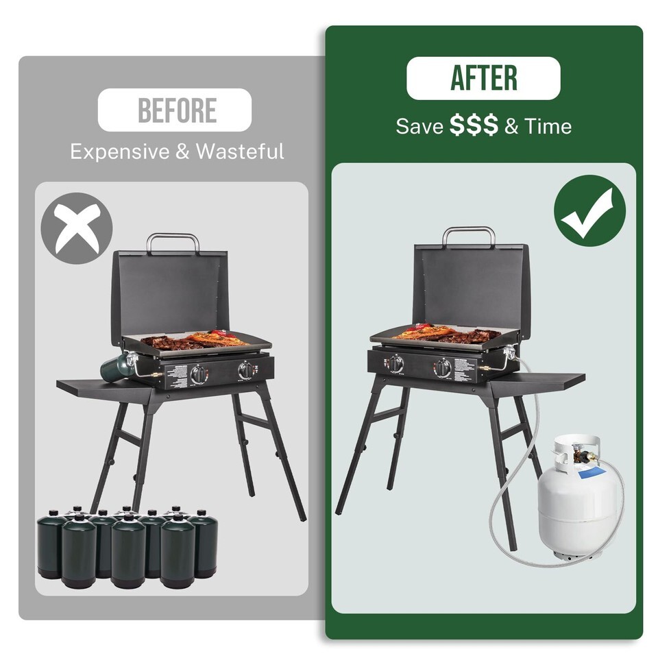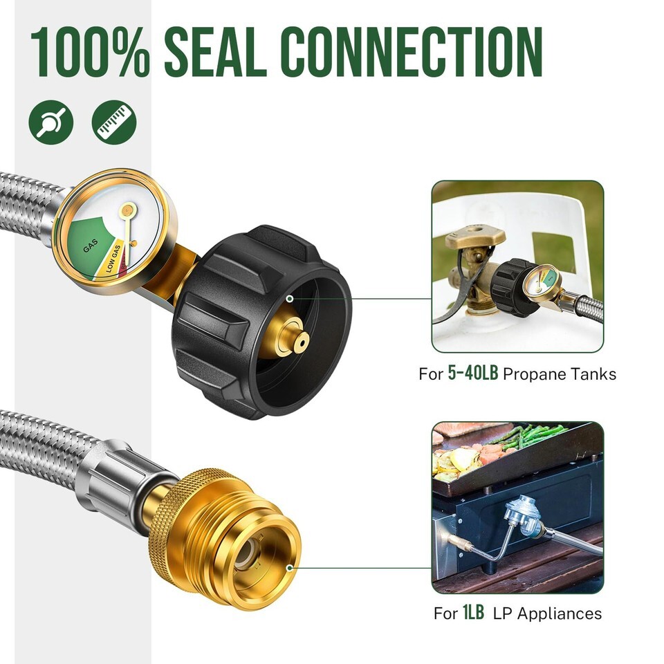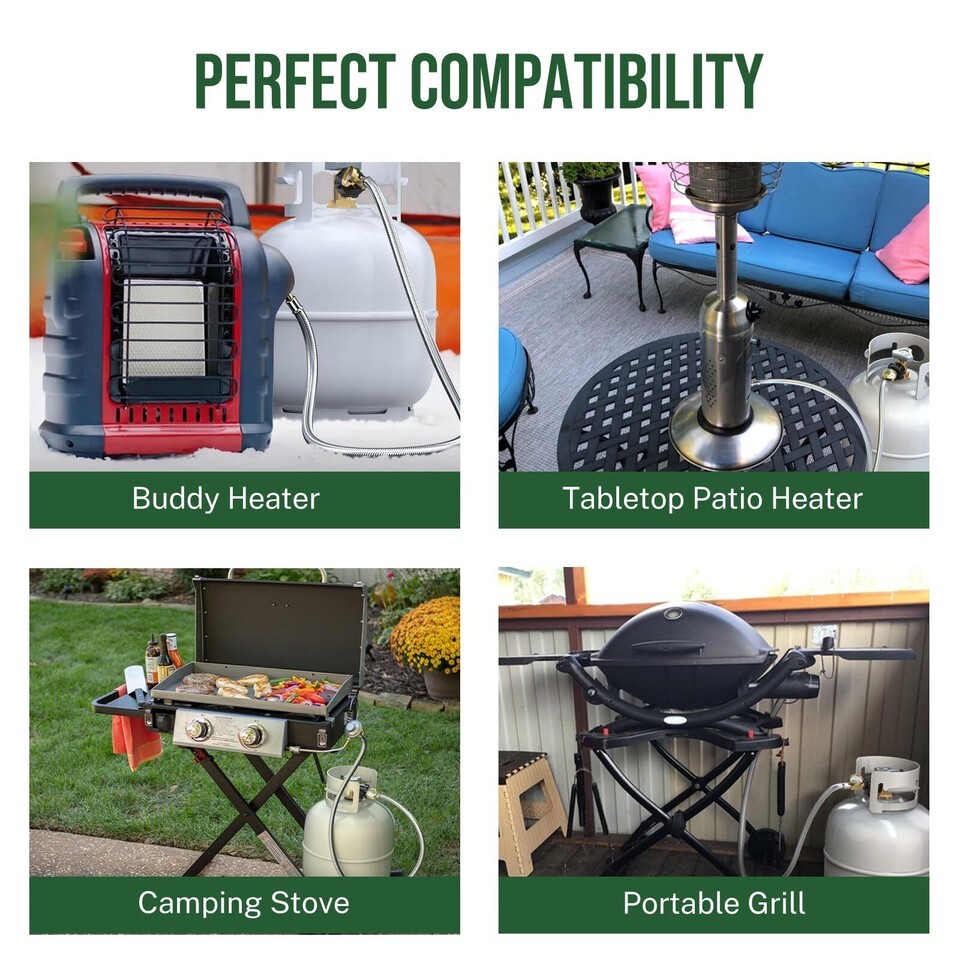 Known for Compatibility ? This propane hose adapter is specifically designed to fit perfectly for Weber Q grills, Coleman camping stoves, Blackstone 17" 22" griddles (regulator needed) and Buddy heaters. Moreover, this propane adapter hose can easily connect most 1lb. LP outdoor appliances to 5-40lb propane tanks, making it an ideal choice for camping, tailgating, heating or outdoor grilling.